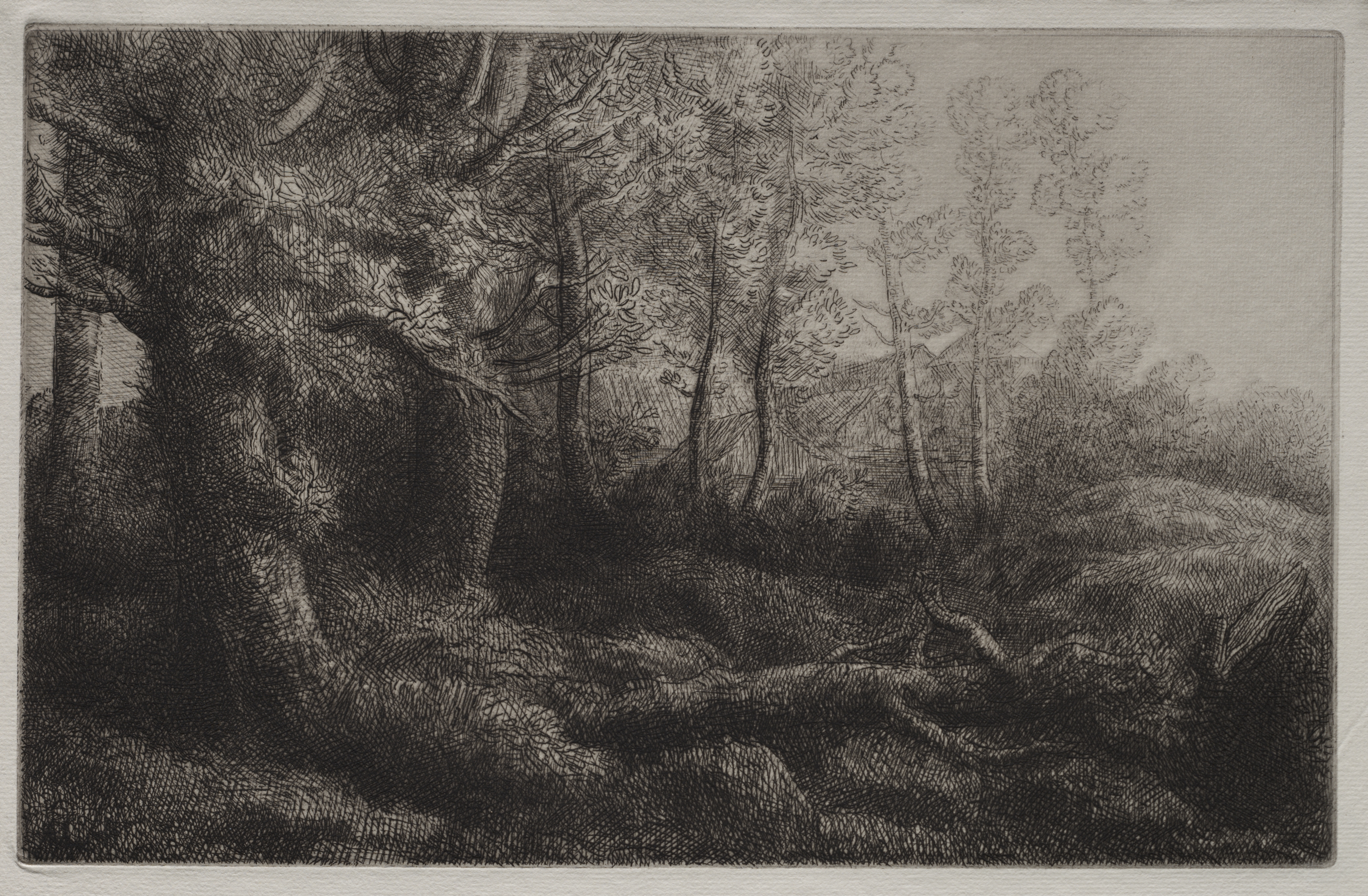 The image depicts a woodland scene; the artwork titled "A Woodland Study" is by Alphonse Legros. The scene is rendered in black and white. A large tree with a thick trunk and branches dominates the left side. The tree's trunk is gnarled and twisted. Multiple smaller trees and bushes are behind and to the right. The ground is covered in grass and other vegetation. The artwork features dense, cross-hatching.