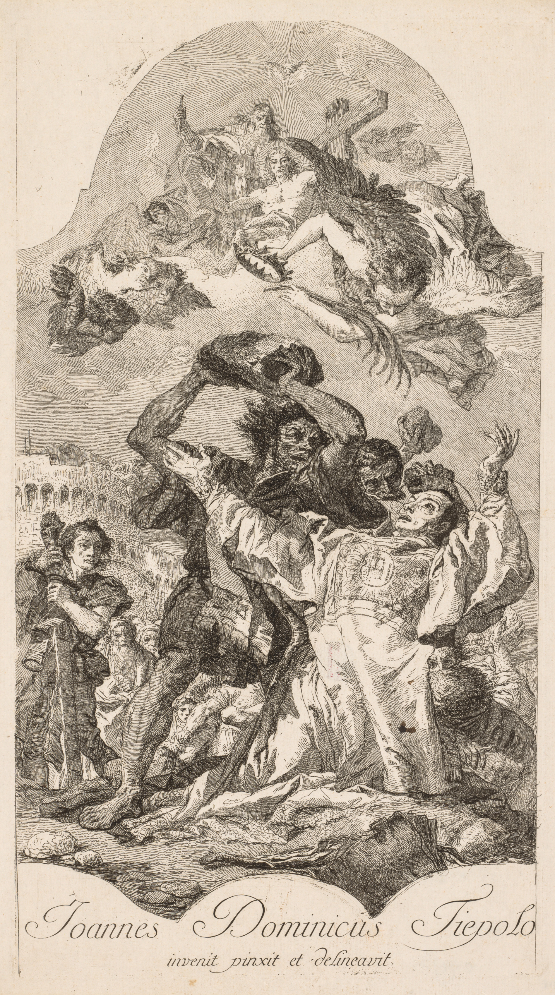 The image depicts a black and white drawing of a dramatic scene. A man in a white robe with his arms raised is being stoned by a group of people. One man is behind him with his arm raised to throw a rock. Another man in the foreground on the right appears to be kneeling. A cityscape with arches is on the left side. At the top, an angel and a semi-nude figure with wings are flying above the scene. Text at the bottom reads "Joannes Dominicus Tiepolo" and some smaller illegible text underneath. The drawing is in a landscape orientation.