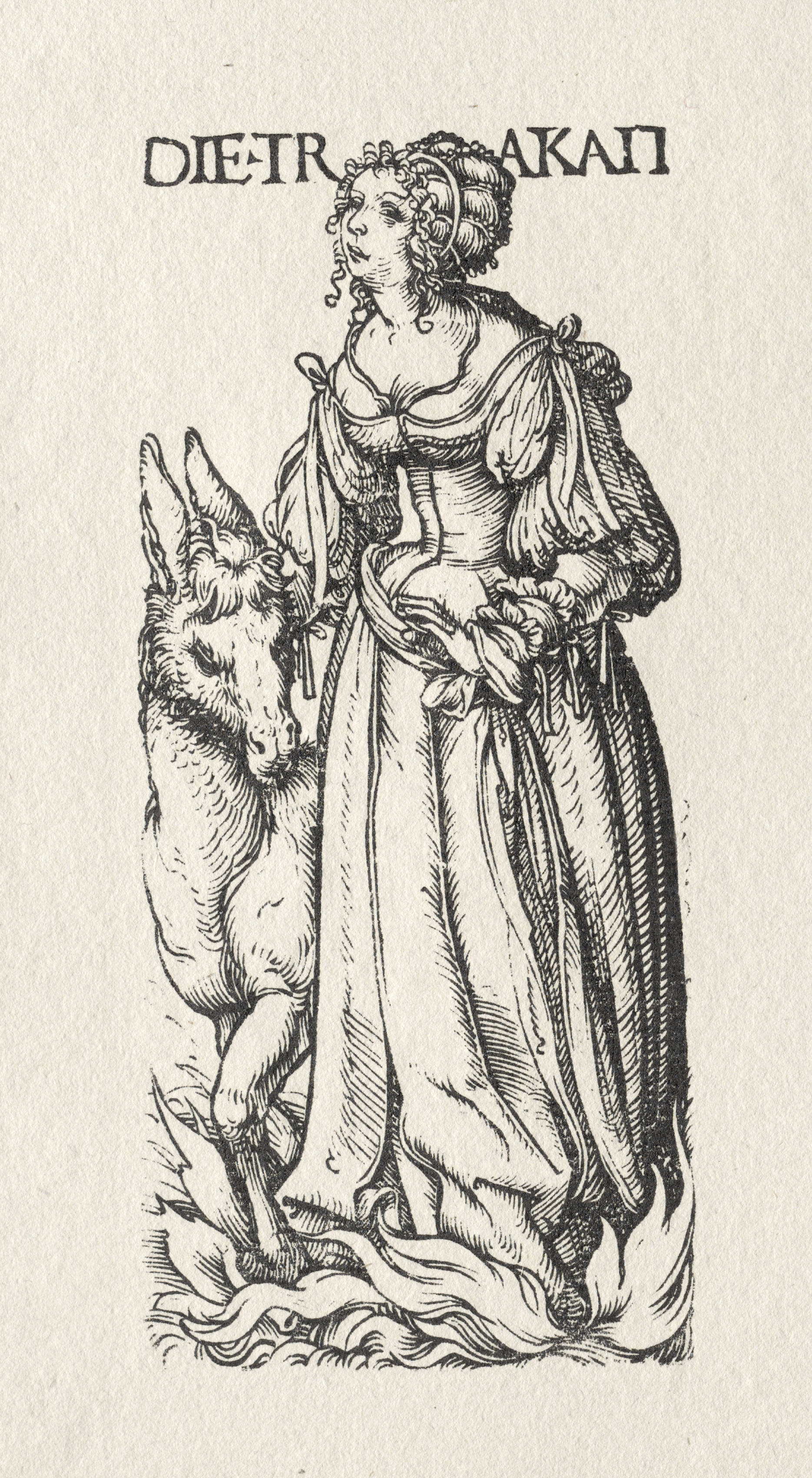 Black and white drawing of a woman in a long dress standing next to a donkey. The woman has curly hair and is looking to her left. She is wearing a low-cut dress with puffy sleeves and a bow at the shoulder. Her right hand is raised. The donkey is standing on the left side of the woman, facing her. It has a long ear and a short mane. The background is a textured beige color with some darker shading around the edges. There is text at the top of the image.