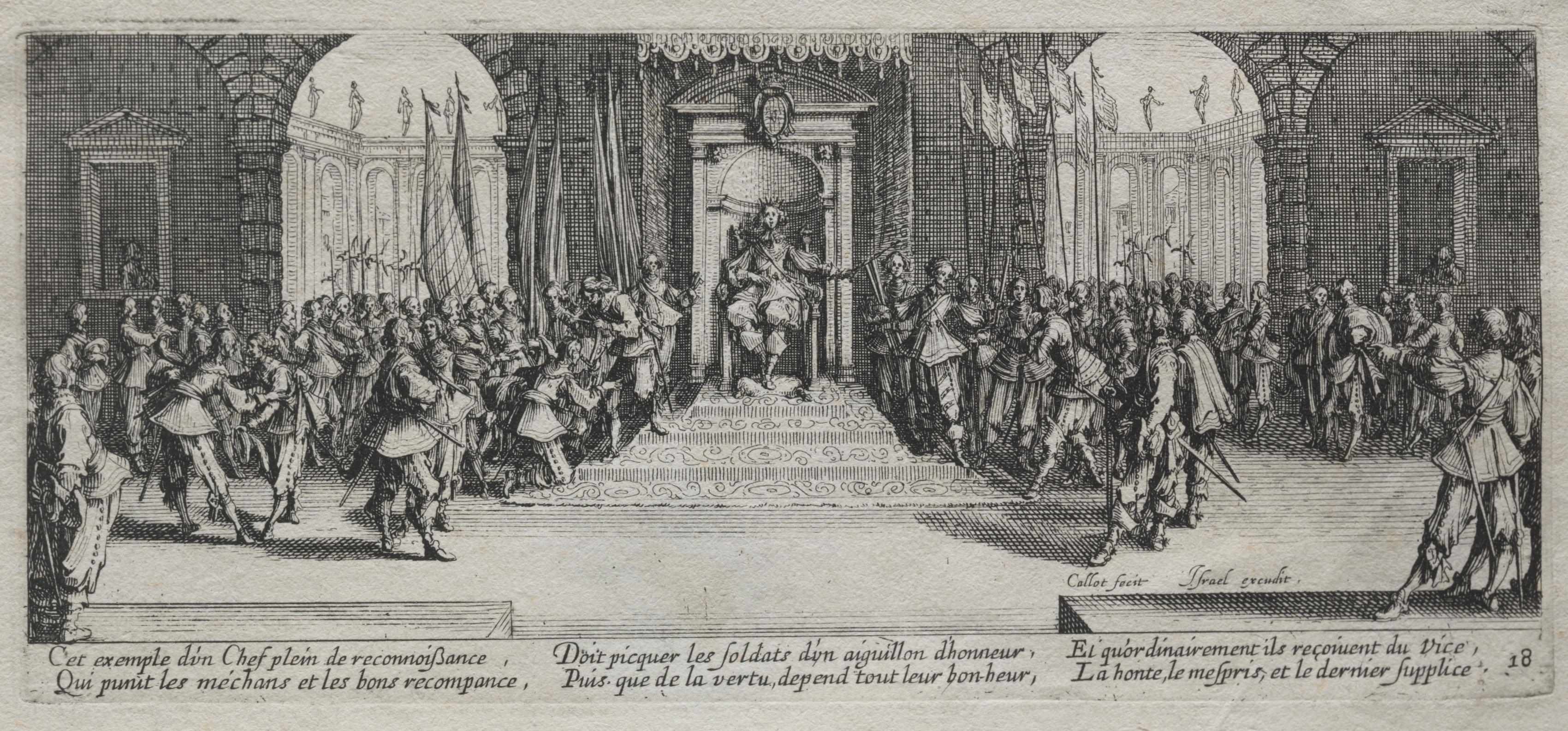 Black and white image, large group scene. King sits on throne in center of image on a raised platform. The king faces outwards, body angled to the right; right hand on knee, left arm bent with hand near chest. The king wears a crown and ornate clothes. Large crowd of people surrounds the king, on both sides of the raised platform. People in 16th or 17th-century European clothing. Some people wear armor and carry weapons. Large stone building with high ceilings and archways. Statues on top of building. French writing in bottom left and right corners. Number 18 in bottom right corner.