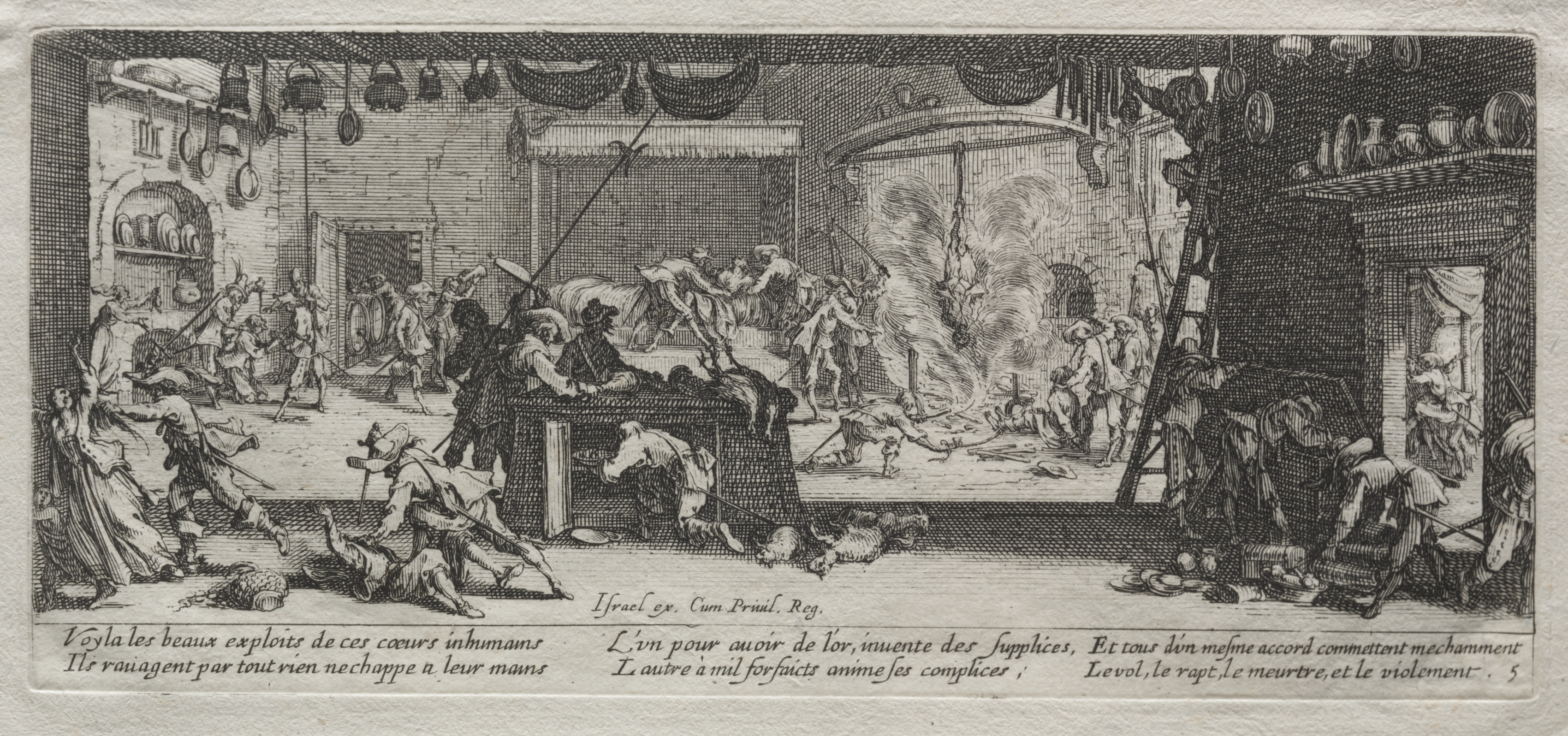 Black and white image. Scene depicts a group of people pillaging a house. Several people are in the room; some are armed with swords and spears. People on the left side are rummaging through belongings on the floor, while others on the right side are climbing a ladder and reaching for items on shelves. There is a fireplace with a pot hanging in the background on the right. Items are scattered on the floor. There are pots and pans hanging from the ceiling throughout the image. The room has stone walls. There is a large piece of furniture in the center with people gathered around it. Text is written on the bottom.
