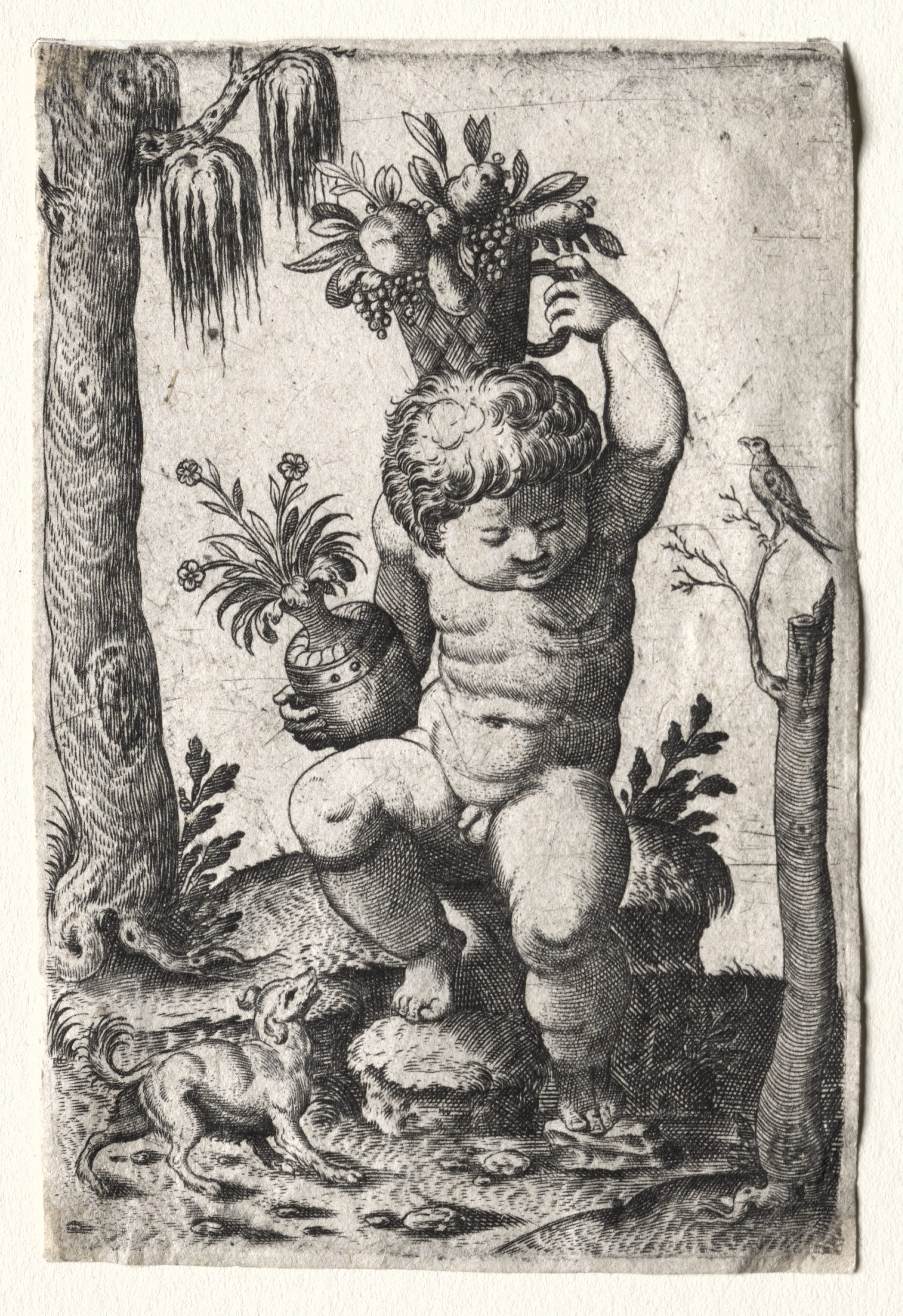 The image depicts the "Boy with Fruit Basket" by Albrecht Dürer, featuring a young boy in a forest scene. The boy has short, curly hair and is naked. He stands on one leg with the other bent in front of him, holding a fruit basket above his head with one hand and a pot with a plant in the other hand. A small bird perches on a tree trunk to the right of the boy. The background includes trees and foliage, with a larger tree trunk on the left side. The image is rendered in black and white, with detailed linework and shading. The overall composition is dense with natural elements and the central figure of the boy.