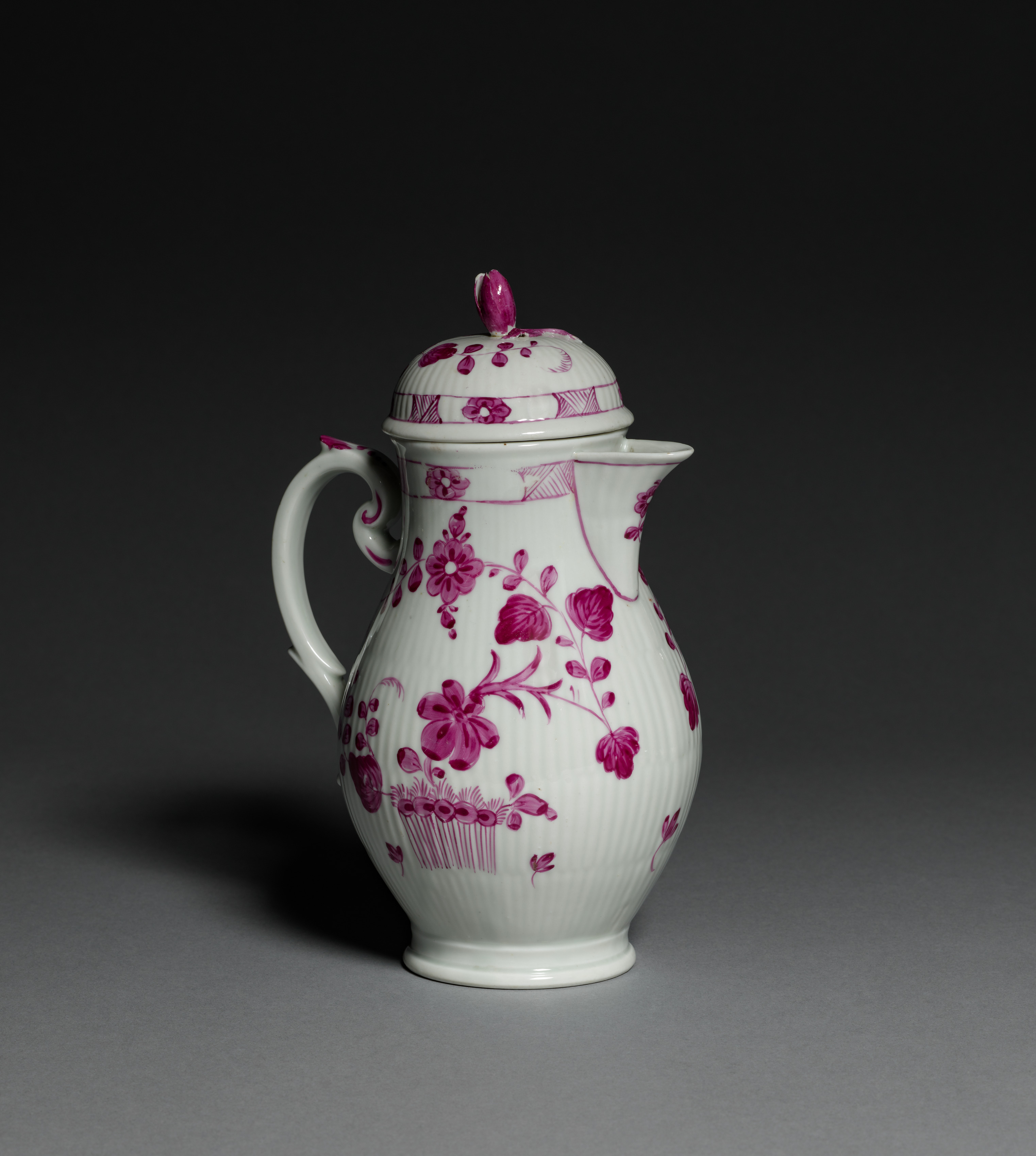 White porcelain chocolate pot with purple floral design and handle on left side. The pot has a ribbed body, a spout on the right side, and a lid with a small finial on top. The lid and body are decorated with a purple floral pattern, including flowers and leaves. The background is dark gray, with a shadow cast by the pot on the left side.