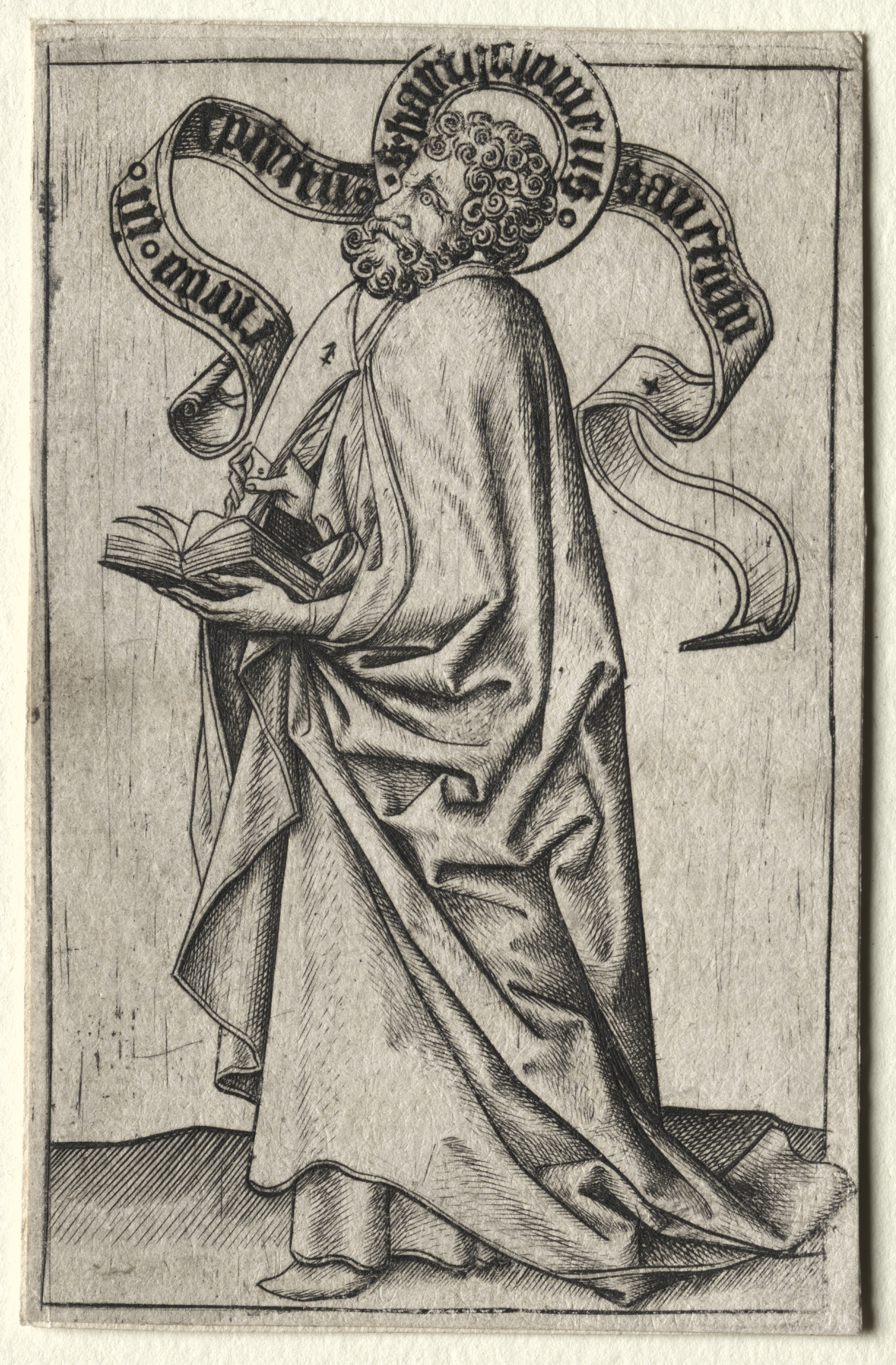 Black and white image of a man with curly hair and a beard wearing a robe, holding an open book in his left hand and a knife in his right. A halo surrounds his head with a banner. He stands on a flat surface with a wall behind him. The man is turned to the left. The image is a drawing or engraving with detailed lines. The text on the banner reads "S. Bartholomeus Apostolus".