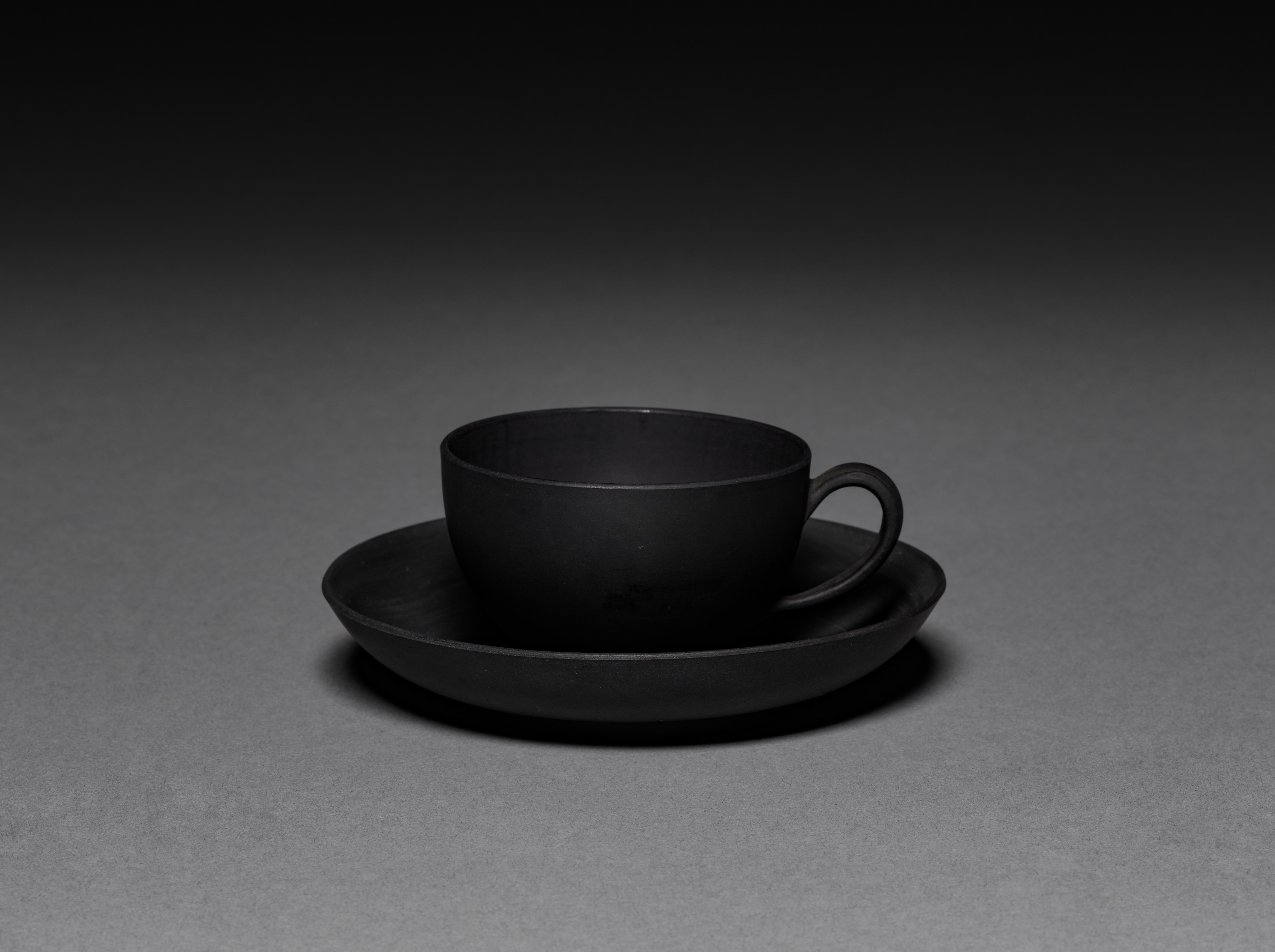 The image shows a matte black teacup and saucer. The teacup is positioned on top of the saucer, slightly to the right of center. The teacup has a small handle on its right side. Both the teacup and saucer are a uniform matte black color with no visible patterns or designs. The background is a gradient of dark gray to black, with the cup and saucer casting a shadow on the surface below. The surface is flat and even.