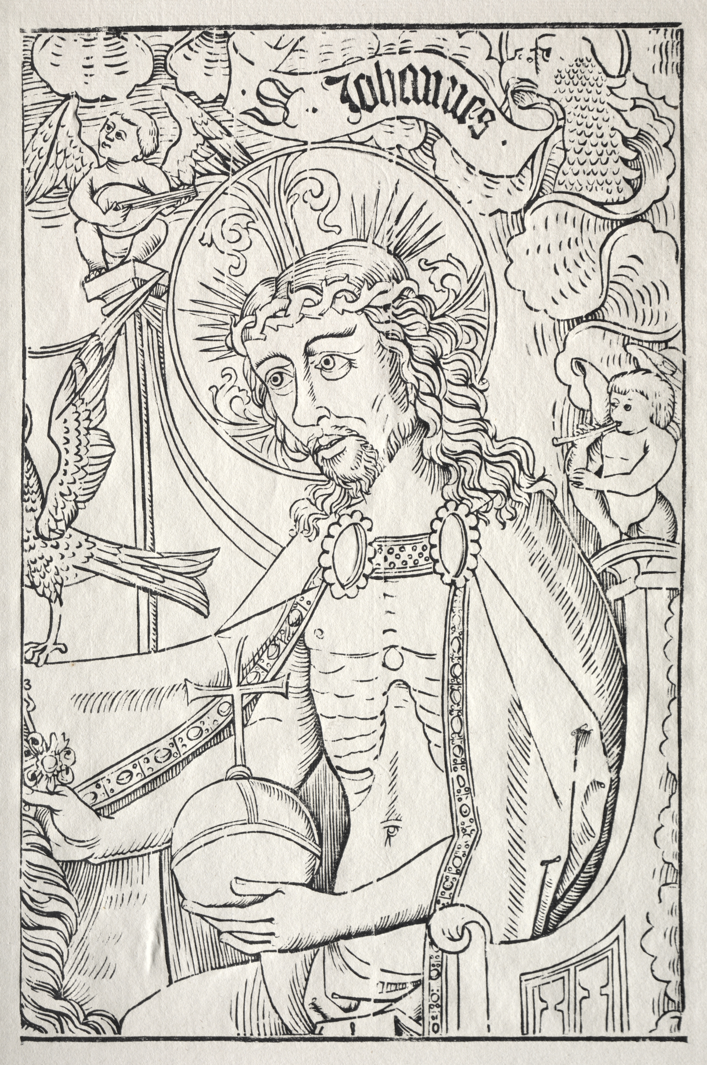 Black and white illustration of a man with long wavy hair and a beard, wearing a decorative robe. The man has a halo behind his head with lines radiating from it. He sits on a throne-like chair with ornate carvings. The man has his right hand on a bowl and holds a decorative staff in his left hand. There are two small winged cherubs, one on the left playing a stringed instrument and one on the right playing a wind instrument. There is a bird on the left. There is a banner at the top with the word Johannes. The title is 'Christus im Halbfigur' by artist Albrecht Durer.