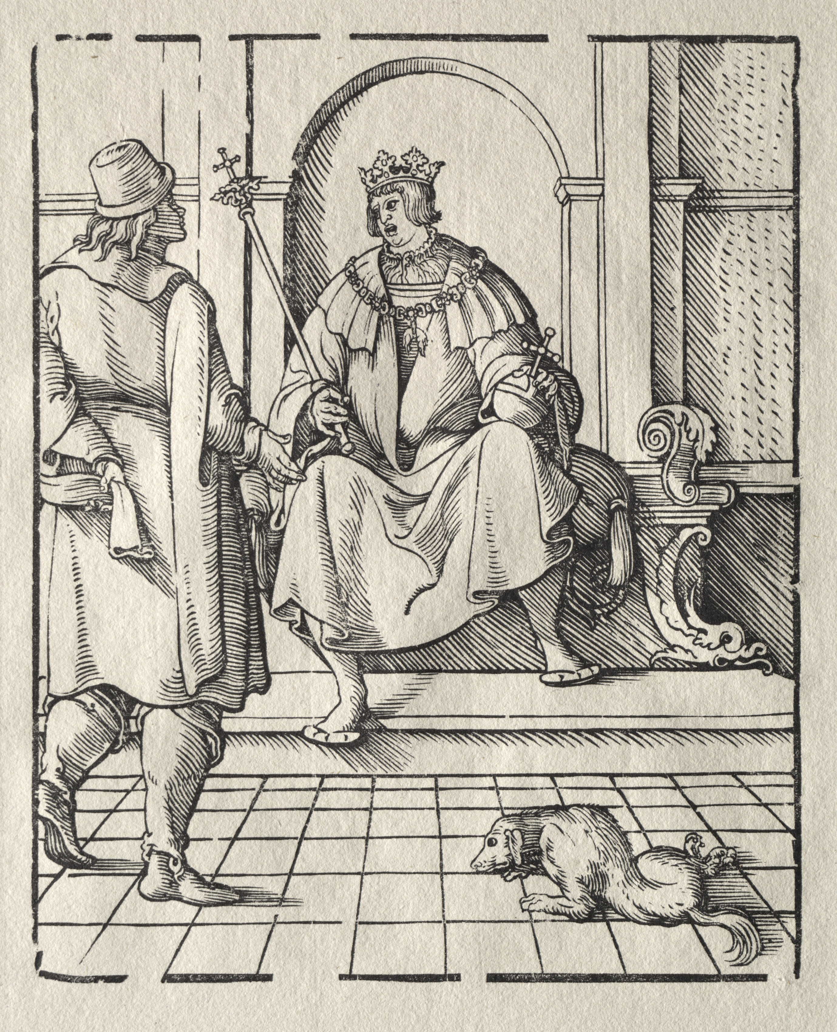 Black and white drawing of a king sitting on a throne. The king has a crown on his head and a sceptre in one hand. He wears a long robe. There is a dog lying on the floor. A man stands to the left. He wears a cape and a hat. The background has a tiled floor, and an ornate archway.