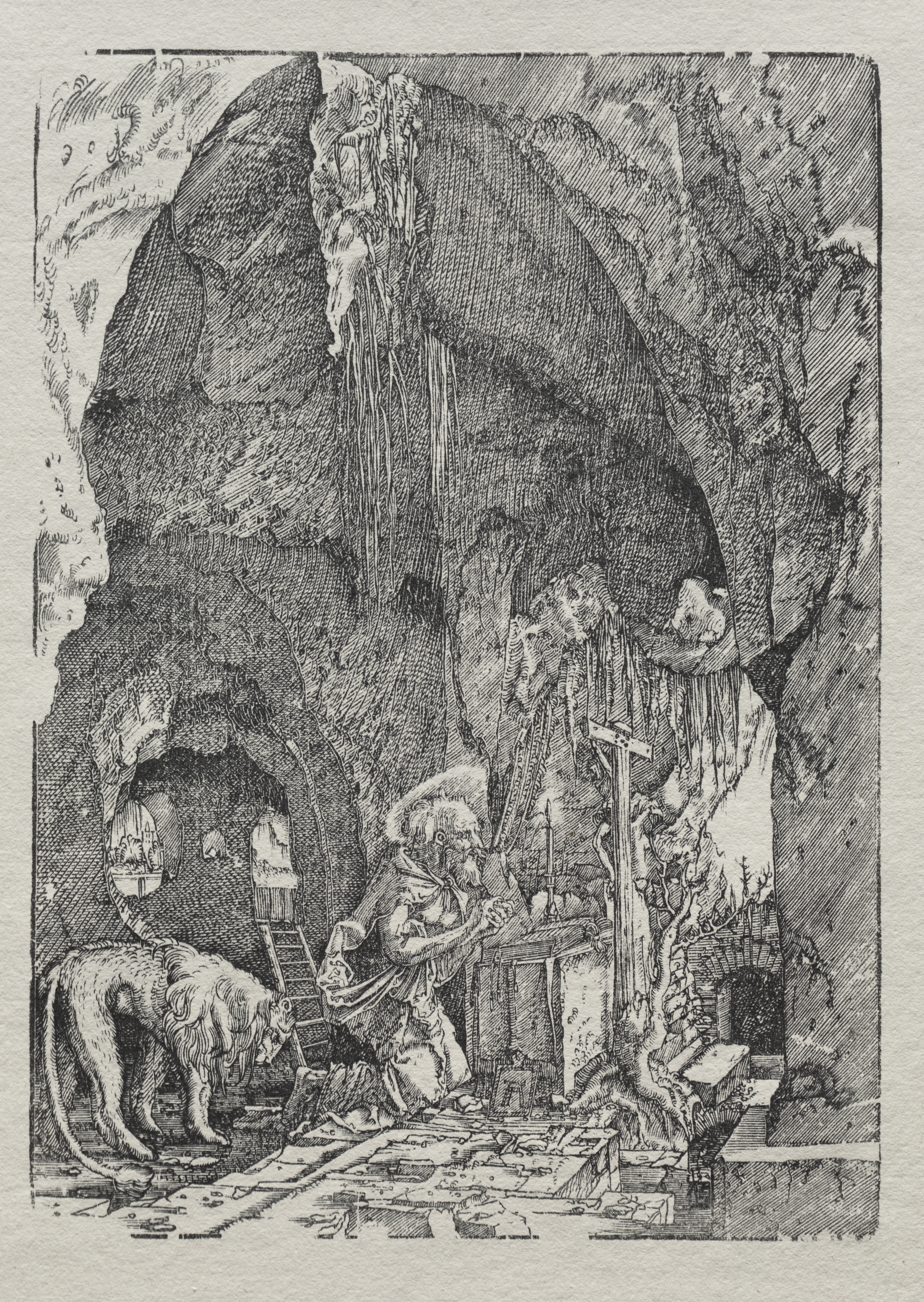 Black and white drawing of a cave. A man with a long white beard wearing a hat, robe, and glasses sits on the ground at a desk. A lion stands to his left, facing right. The man holds an open book. A skull rests on a book to his right. A crucifix stands beside the desk. A ladder leans against a wall on the left with a hanging lantern beside it. The walls of the cave are rocky. A small table with an object on it sits to the right.