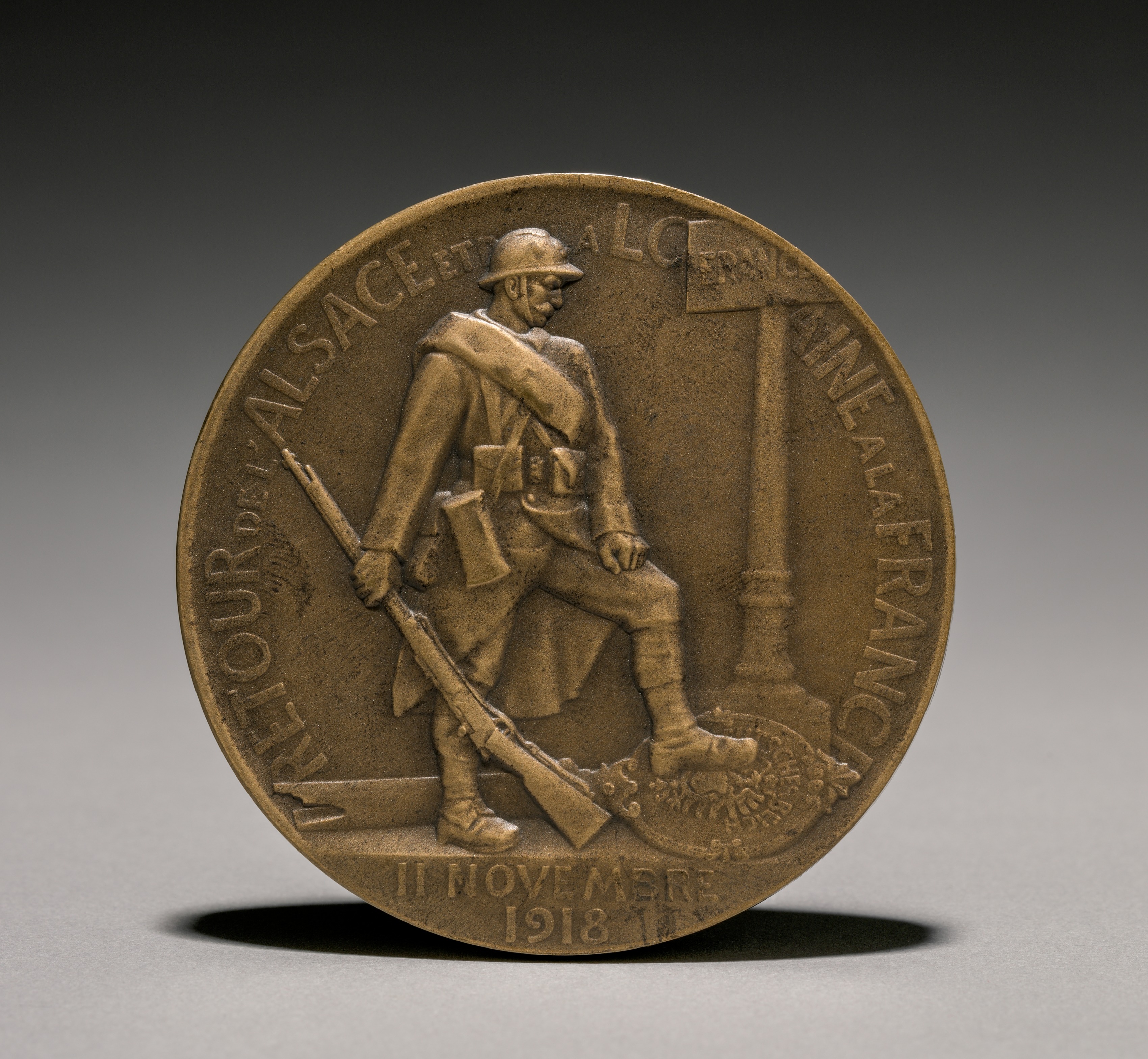 Bronze-colored medal with a raised image of a soldier in uniform and a helmet, holding a rifle. The soldier is sitting on something with his right leg bent and his left leg straight. He is wearing a long coat and boots. To his right is a tall, thin pole with a square flag on top. The words "LETOUR DE L'ALSACE ET A LA" are written in raised letters at the top of the medal, curving around the edge. The words "Victoire" and a second set of words are written on the left side, curving around the edge. The words "11 NOVEMBRE 1918" are written in raised letters at the bottom. The background is gray.