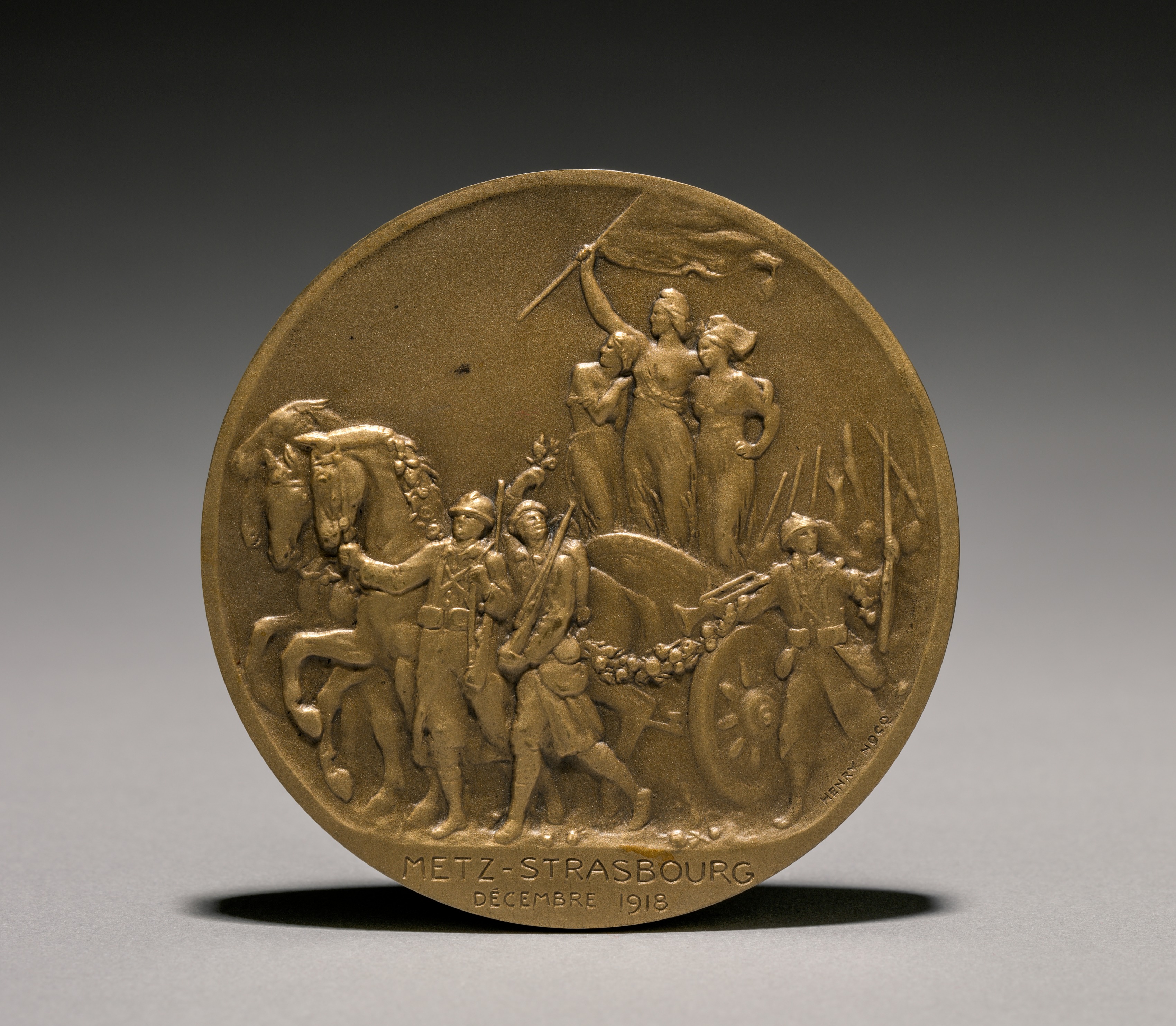 The Poincare-Clemenceau Medal's reverse side features a gold-colored, circular relief sculpture. The scene depicts a horse-drawn chariot with two horses visible. Three men in military uniforms pull the chariot from the left; one man holds the horse on the left by the bridle, while another man holds a large wheel. The third man on the left holds a long spear. The chariot contains three figures: one woman holds a flag on a long pole, another woman stands to her right, and a third figure is partially visible behind them. The woman on the right holds a long spear. The bottom of the medal features the text "METZ-STRASBOURG DECEMBRE 1918". The medal rests on a gray surface with a dark shadow behind it.
