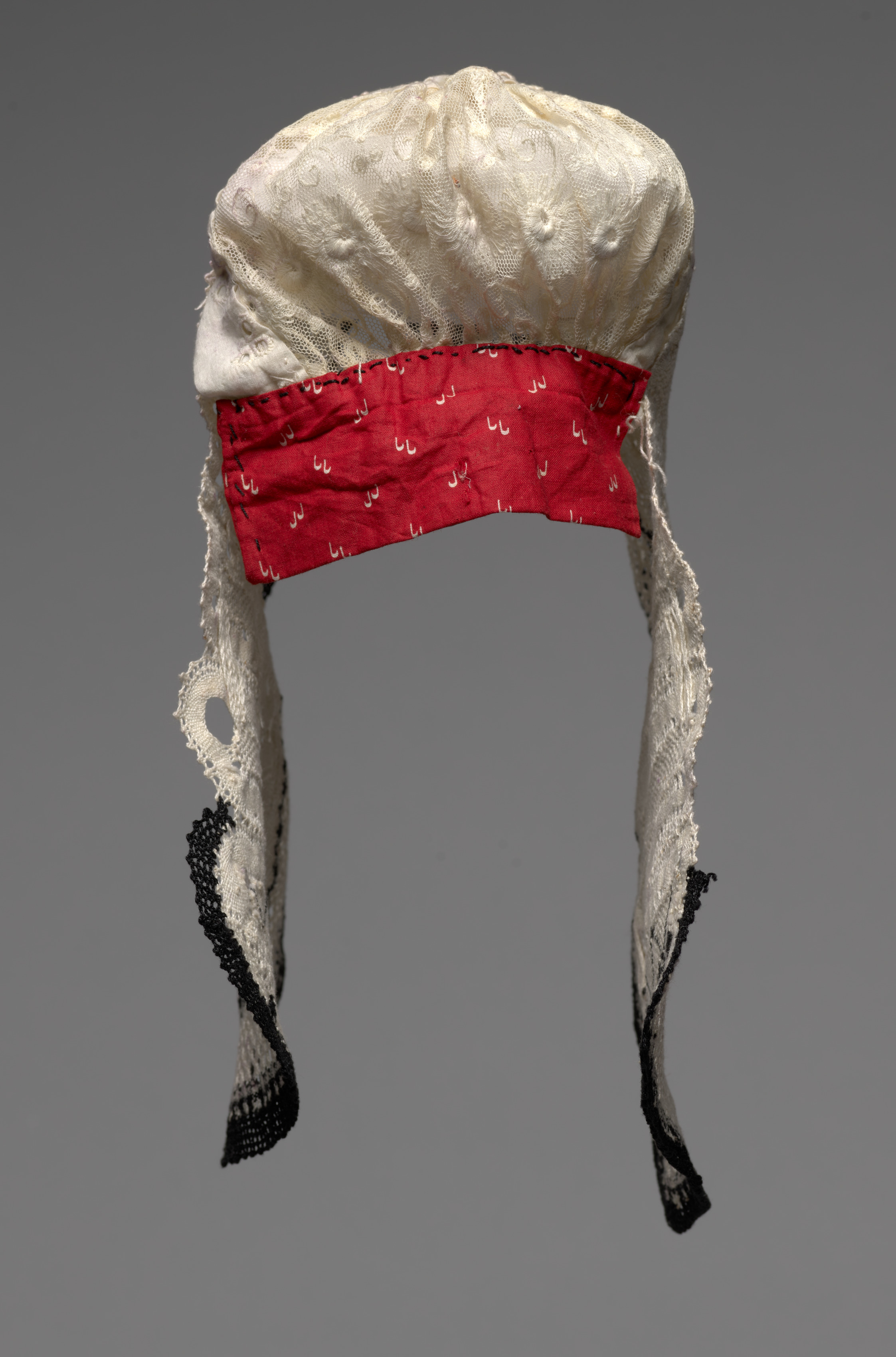White bobbin lace cap with a red cotton band around the forehead area. The cap has a rounded top and two long ties hanging down on either side, made of white lace with black trim at the ends. The lace is intricately designed with floral patterns. The red band features small white designs. The background is grey. The cap is titled "Bobbin Lace Cap".