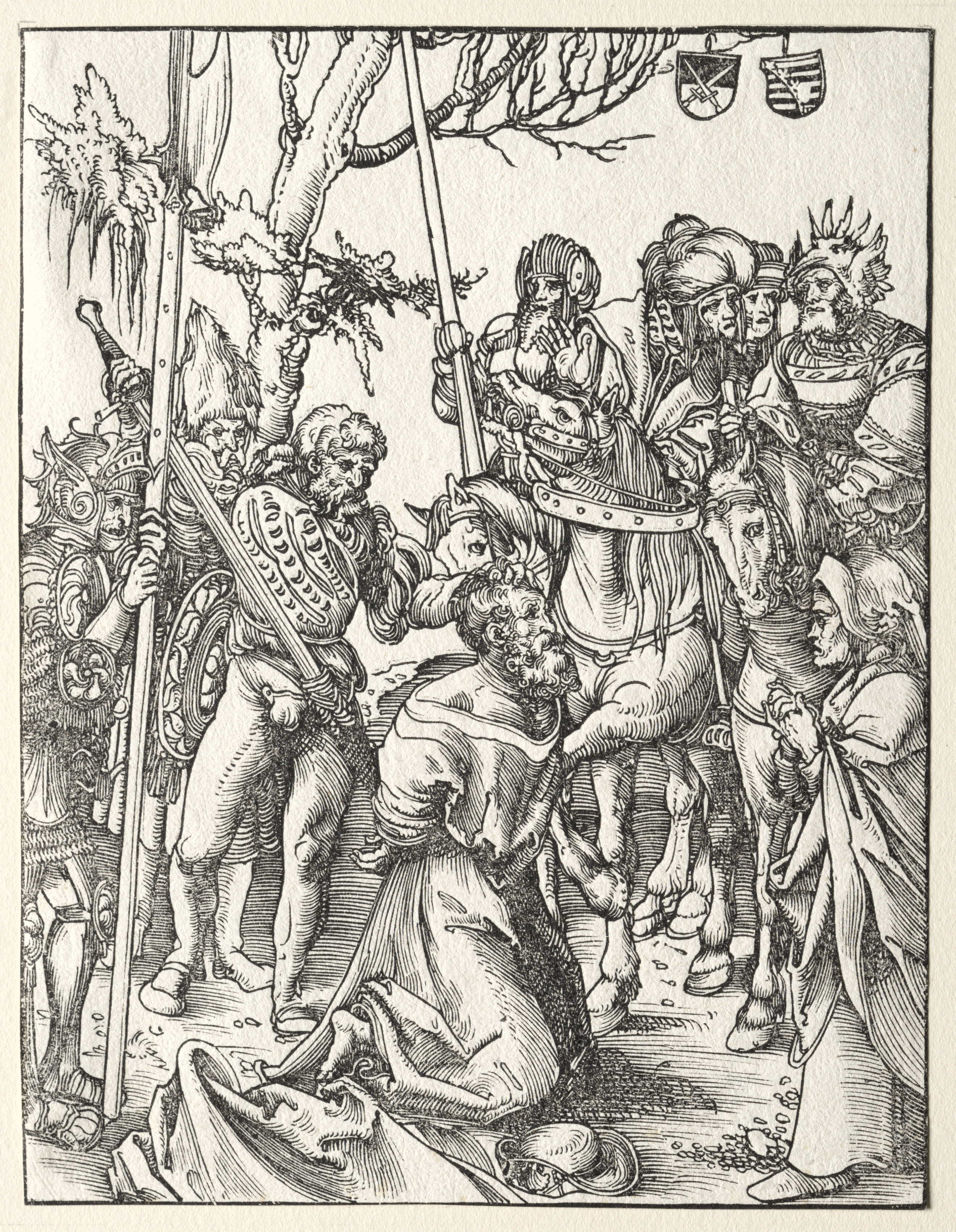 Black and white image of a man on one knee being beheaded with a sword by a man in armor. The man on one knee wears a long robe and has a long beard and hair. Two coats of arms hang from a tree branch in the top right corner. Other people in the scene wear armor and stand around. One man on horseback wears a crown. The scene takes place under a bare tree. The man on one knee faces left. A hat lies near him on the ground.