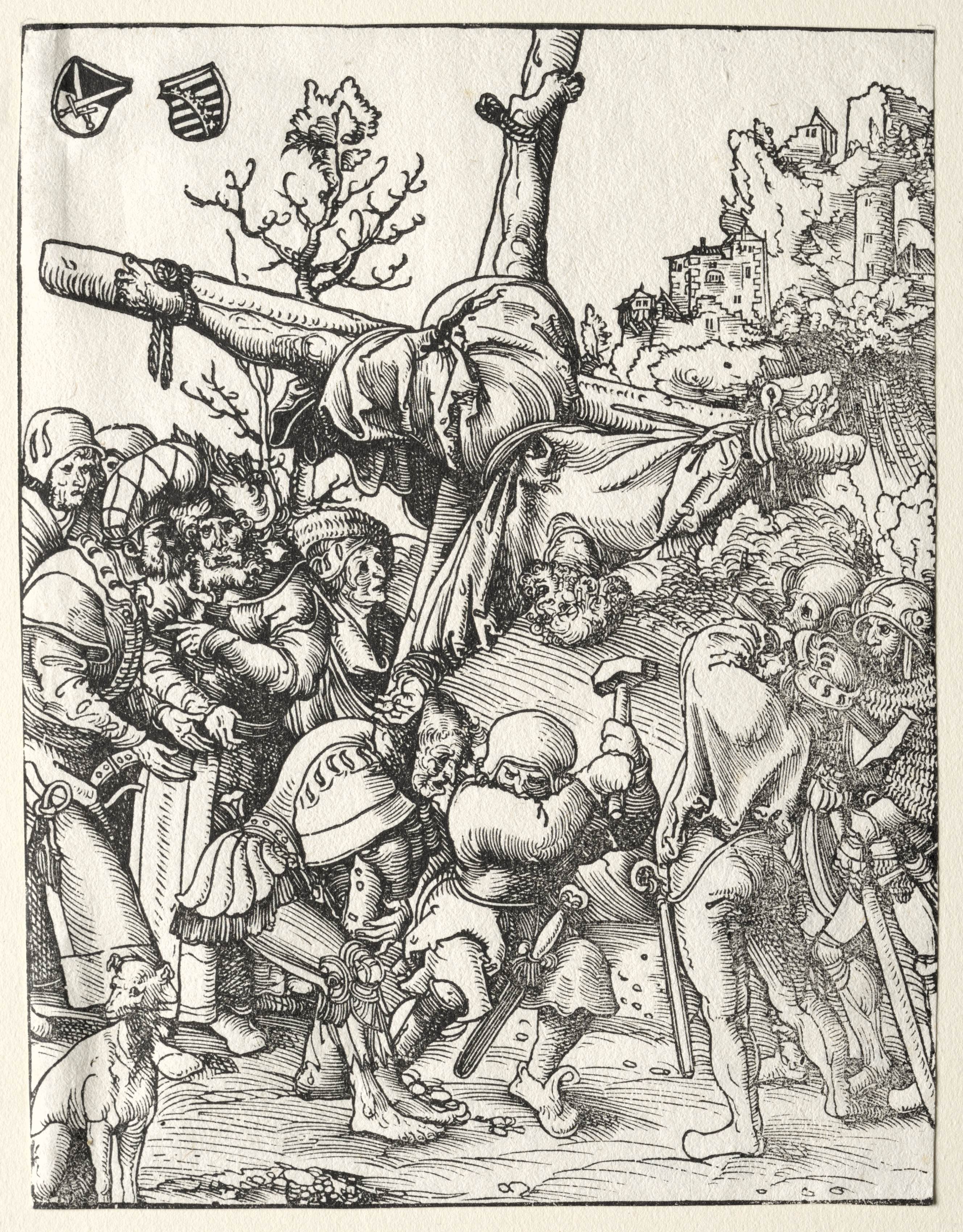Black and white image of a man being nailed to a cross. The man is positioned upside down on the cross. He has a cloth covering his lower body. His arms are stretched out to the sides and nailed to the cross. There are two shields in the top left corner. A group of men in 16th-century clothing are surrounding the man on the cross. Some of the men are holding tools like hammers and nails. There is a dog standing on the bottom left. In the background, there are trees, buildings, and a cityscape. The image has a border around it.