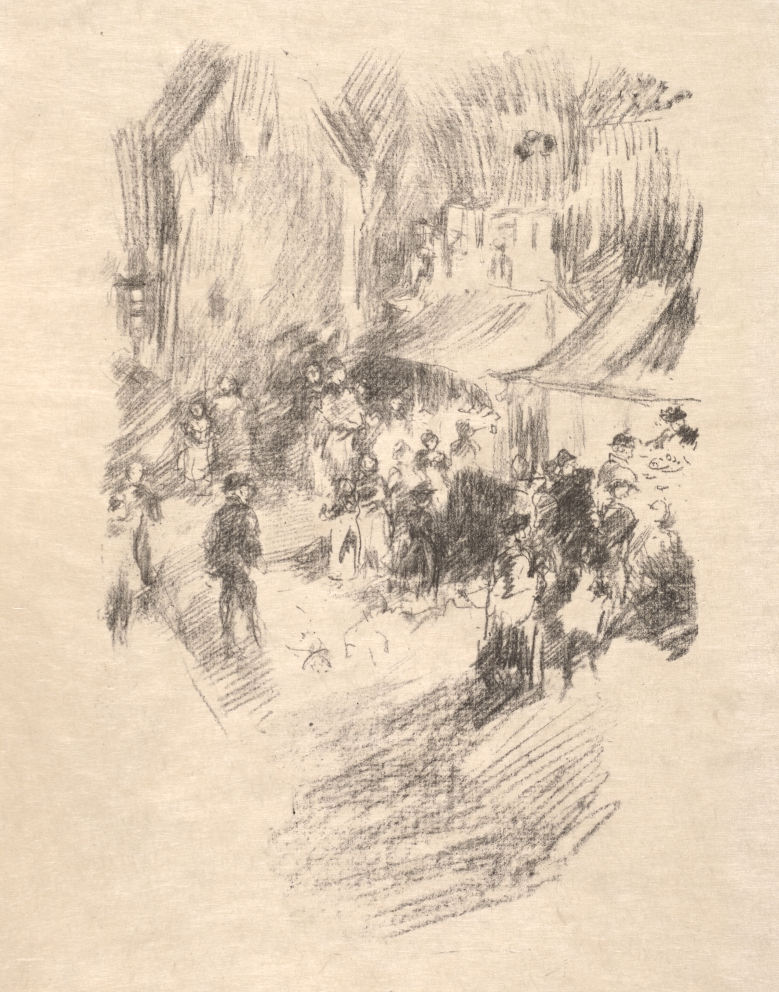 The painting "Fair, Lyme Regis" by James McNeill Whistler depicts a scene with a crowd of people gathered. The scene shows a group of people standing on what appears to be a street or pathway with buildings in the background. The image is rendered in charcoal or pencil on a light-colored background. The people are dressed in clothing typical of the late 19th century. The scene appears to be a fair or market in the town of Lyme Regis. The buildings in the background are tall with sloping roofs. The drawing style is impressionistic with loose lines and shading. The overall mood of the scene appears to be lively and bustling. The image conveys a sense of a casual gathering of people. The town setting is depicted with simple architectural details. The artist's use of shading creates depth in the scene. The composition is informal with figures placed in a seemingly spontaneous arrangement.