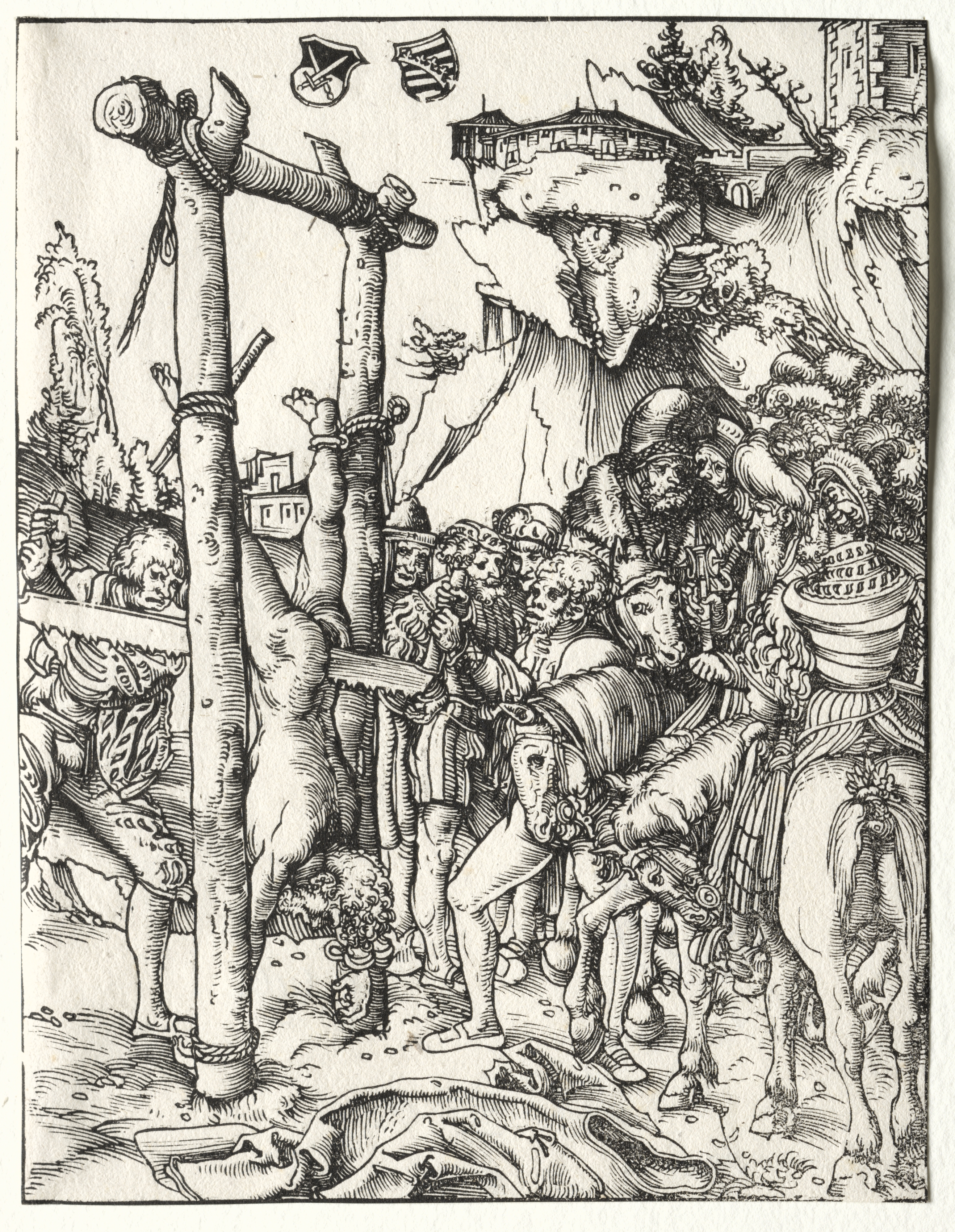Black and white woodcut artwork depicting the Martyrdom of St. Simeon. St. Simeon is nailed to a T-shaped wooden structure. His body is bare except for cloth wrapped around his waist. He faces right with arms stretched out. The nails in his hands are visible. His head tilts to the right. His mouth is open. Two men on either side hold the structure. A man on the left holds a hammer. Behind them, people are gathered, some on horseback. Some people hold weapons like spears and swords. A horse's head is visible. Trees and buildings are in the background.