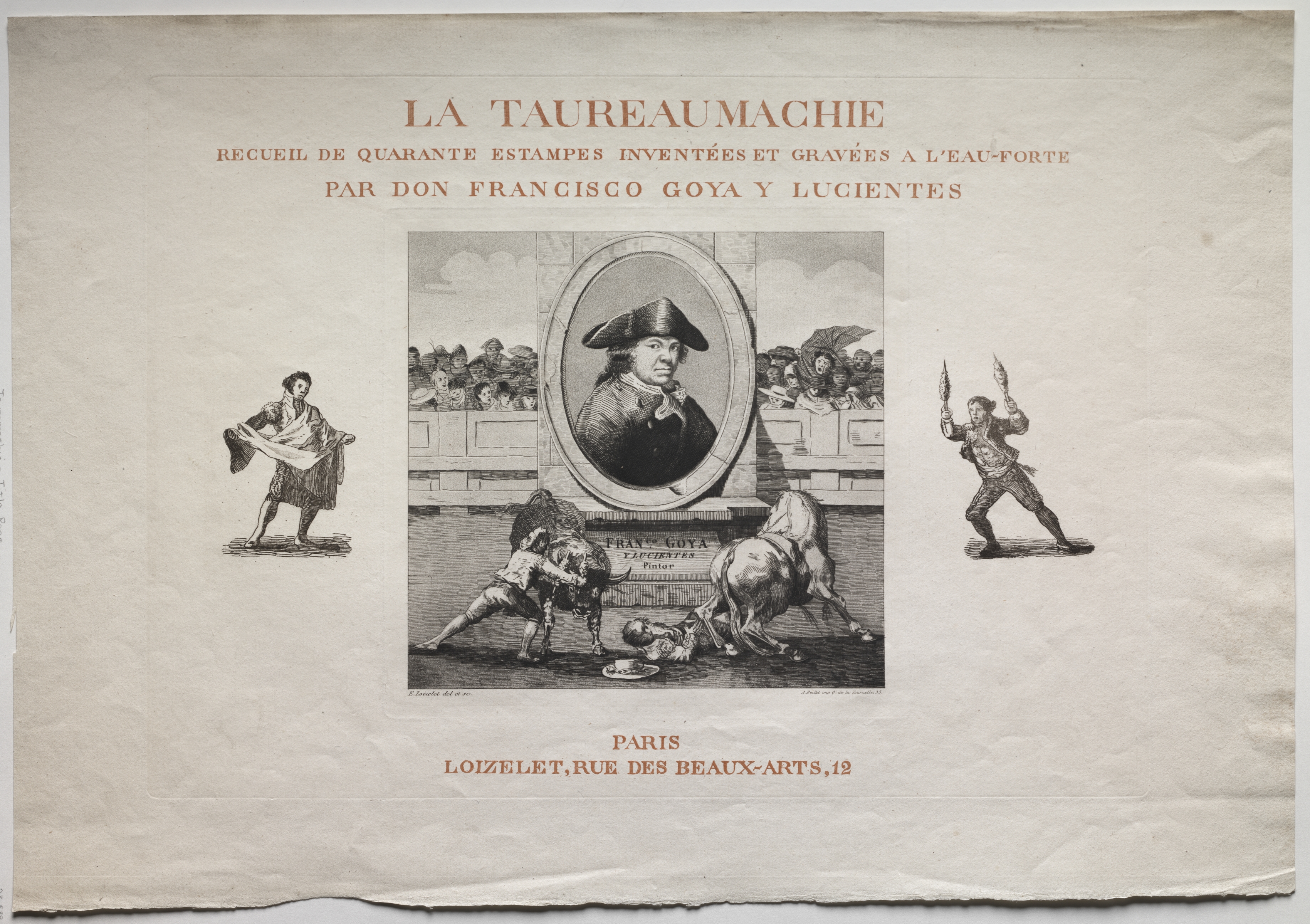 The image features a title page with the words "LA TAUREUMACHIE" prominently displayed at the top, followed by smaller text that reads "RECUEIL DE QUARANTE ESTAMPES INVENTÉES ET GRAVÉES A L'EAU-FORTE PAR DON FRANCISCO GOYA Y LUCIENTES". The page has an off-white background with a slightly darker off-white oval frame in the center containing a portrait of a man wearing a hat. The man in the portrait has dark hair and is dressed in 18th-century attire. Below the portrait, a scene depicts a bullfight: a bull is positioned on the right, a fallen man on the ground in the center, and a man holding a sword on the left. A crowd of onlookers is visible in the background. On either side of the central image, two smaller illustrations are present. The left illustration shows a man holding a cape, while the right illustration depicts a man holding a spear. At the bottom of the page, the text "PARIS LOIZELET, RUE DES BEAUX-ARTS, 12" is printed.