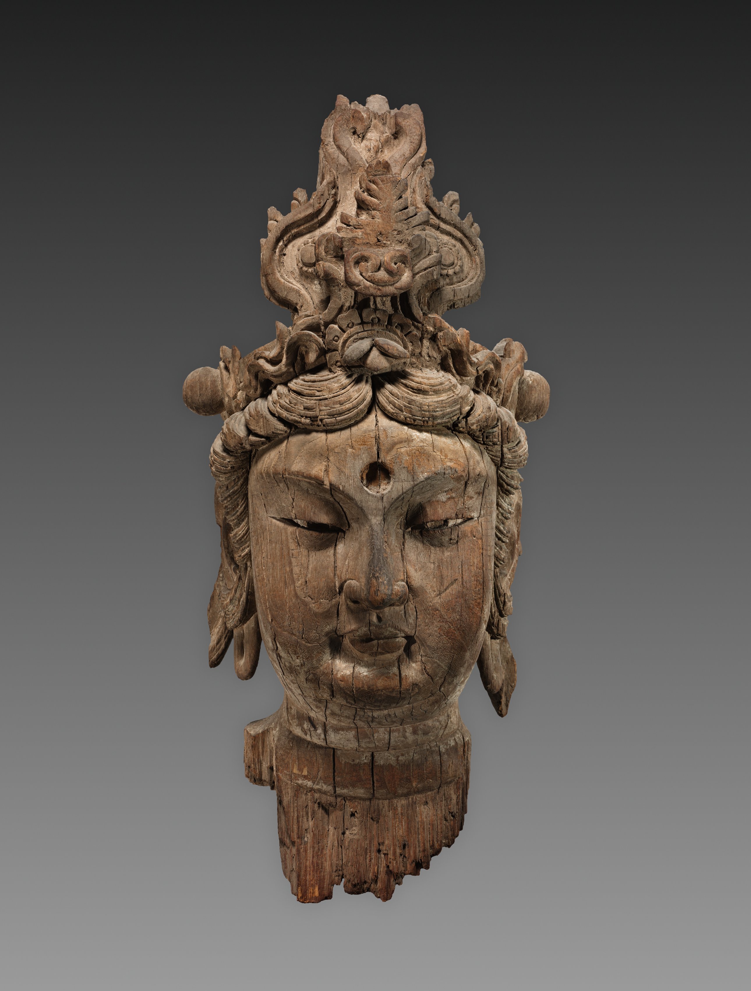 The Head of a Bodhisattva by an unknown artist depicts a carved wooden head. The head is facing forward with eyes closed. The head has a serene expression with slightly curved lips. The head has a crown-like structure on top with intricate carvings that resemble leaves or flowers. The crown-like structure sits on top of the head, which has hair carved into thin strands. The head has a vertical line between the eyebrows. The head appears to be made from a light-brown wood and exhibits signs of aging with visible cracks and a rough texture. The background of the image transitions from dark gray at the top to light gray at the bottom.