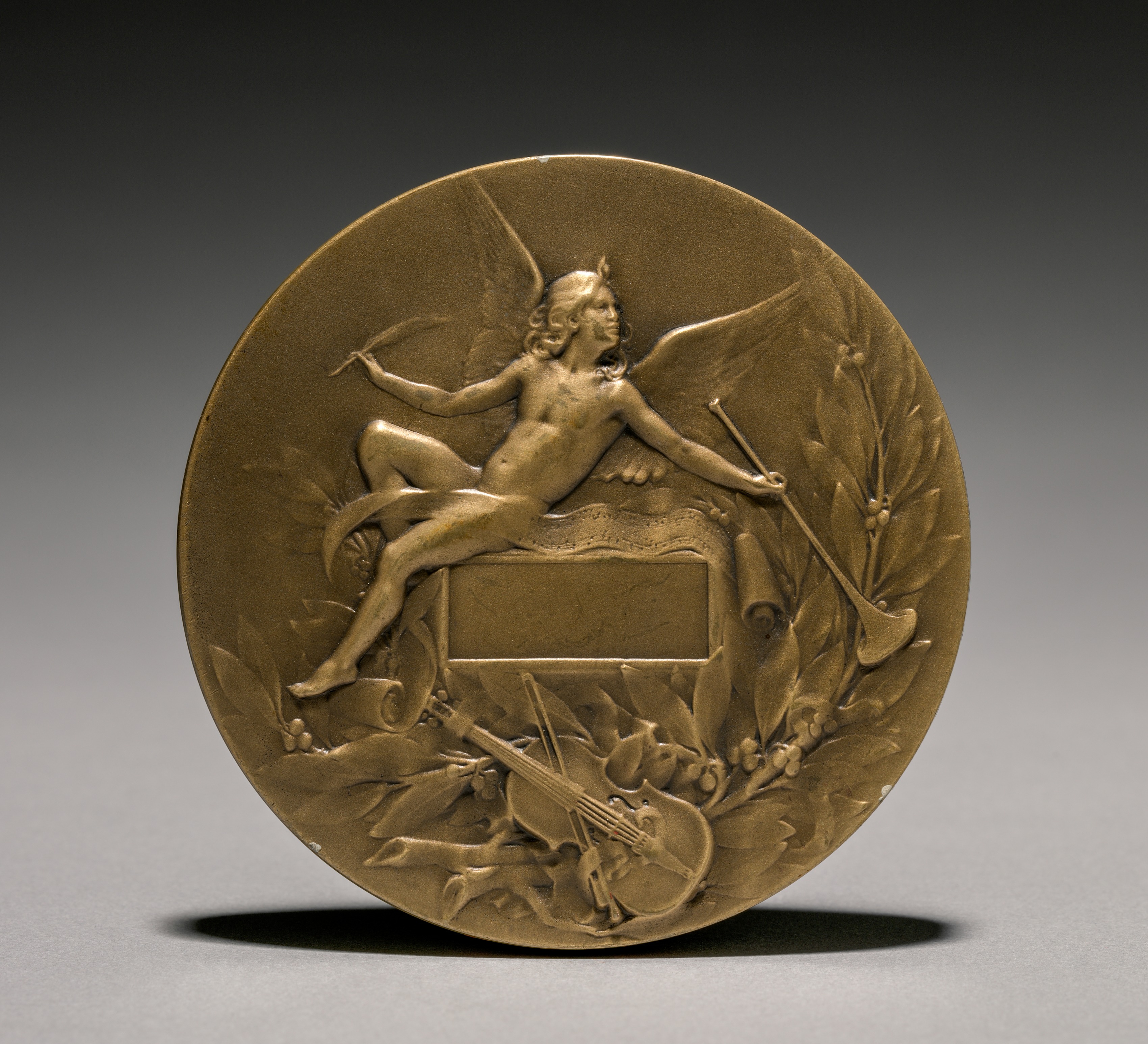 Round bronze medal with raised images. A winged, nude figure with wavy shoulder-length hair sits on a rectangular object. The figure has one leg bent, the other extended. One arm holds an object like a baton or stick, the other arm extended with palm up. The figure sits in front of a rectangle surrounded by a wreath. Musical instruments including a drum and lyre are near the bottom.