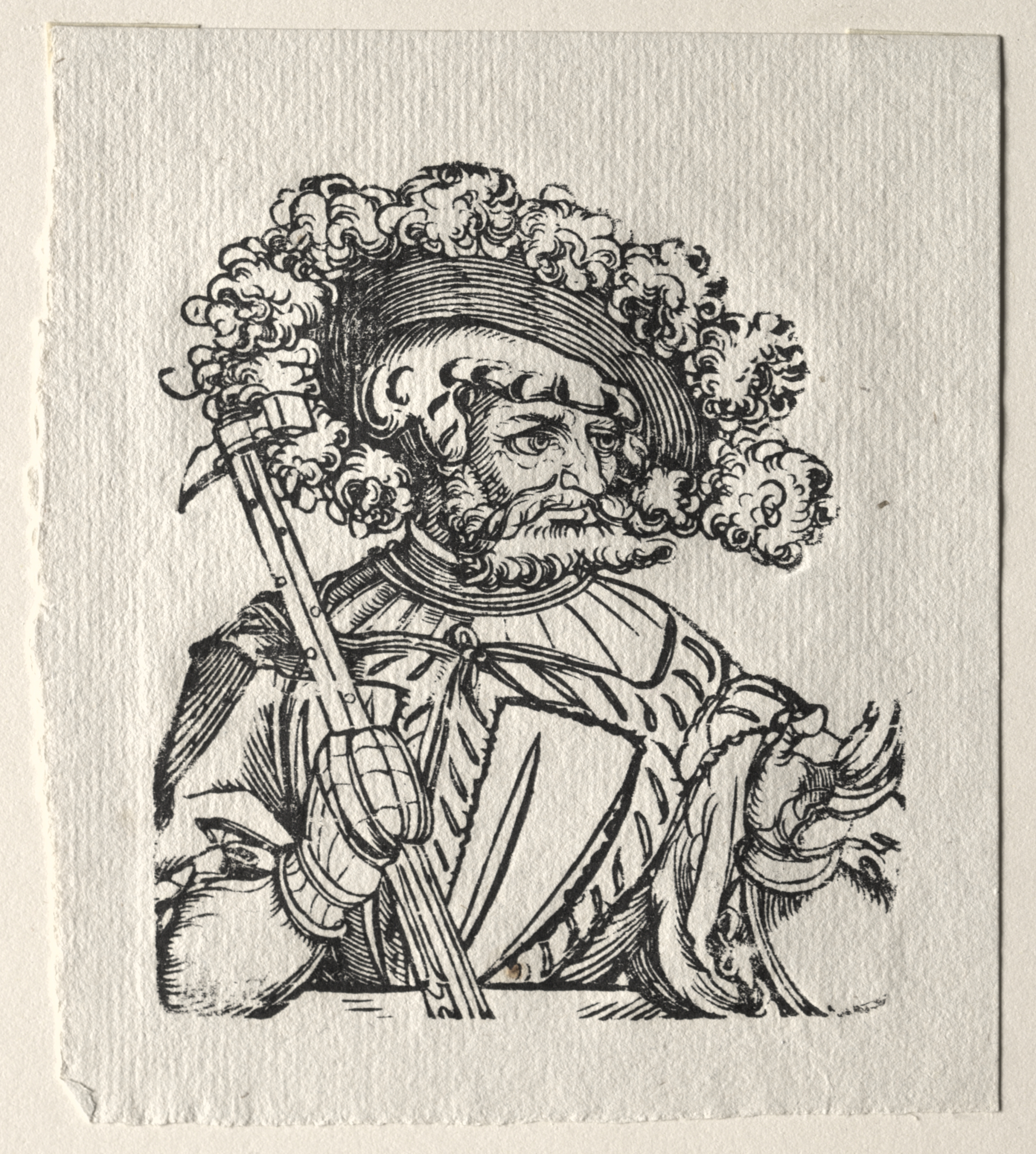 Black and white drawing of a man with curly hair and beard. The man has a serious expression on his face. He wears a hat, robe, and holds a weapon in one hand. A cuff is on the other wrist. The image has a textured background. The man depicted is Holofernes from the Old Testament.