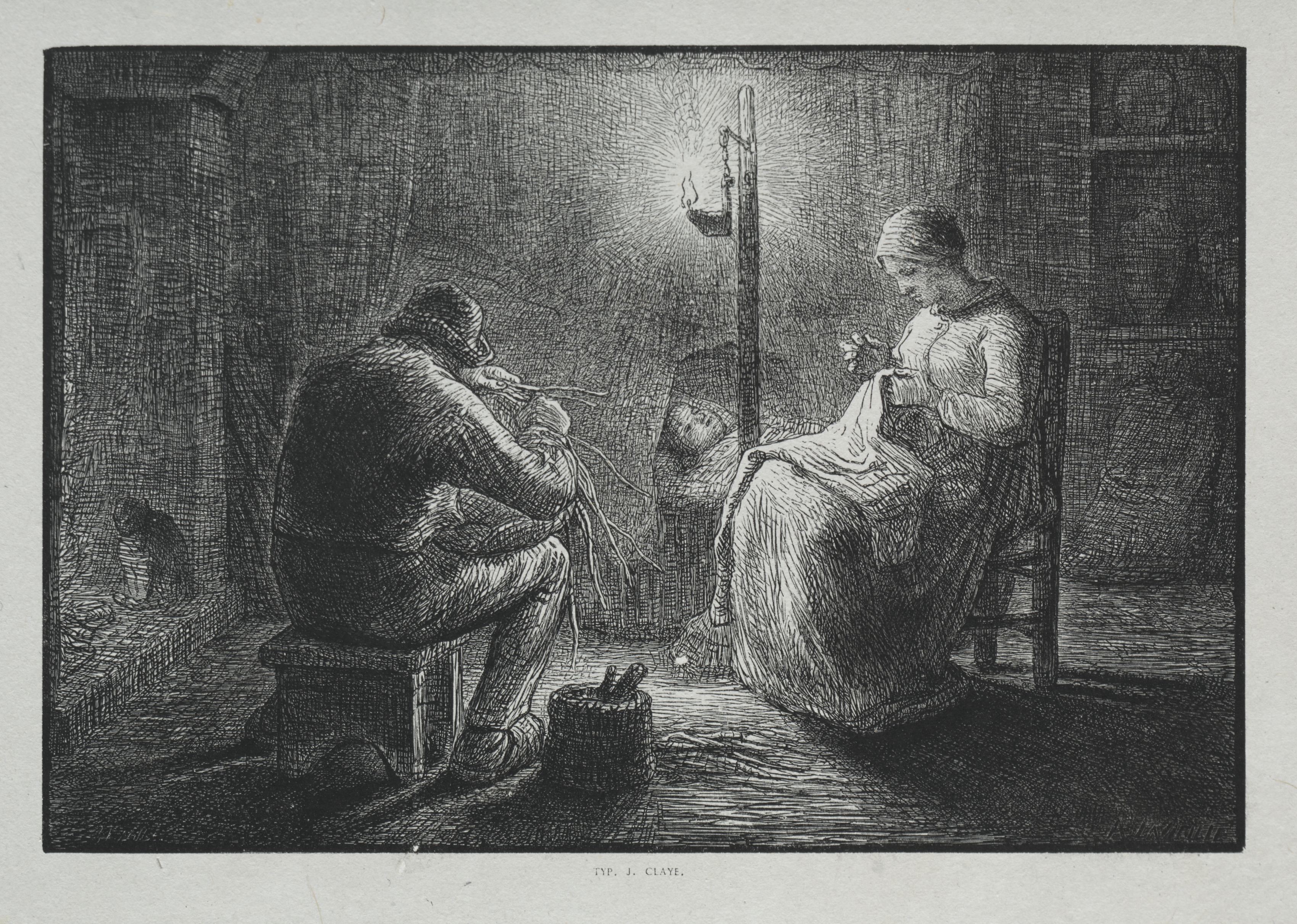 Black and white image of a man and a woman indoors. The man on the left sits on a low wooden block, wearing a hat and a long-sleeved shirt and shorts. He is facing the right with his head bowed down, smoking a pipe. There is a basket on the floor next to him. The woman sits on the right in a chair, facing the left. She wears a long dress and has her hair covered. She holds something small in her left hand. The background on the left shows an opening with a small table and what appears to be a cat. The background on the right shows shelves filled with objects. The room is lit by a hanging oil lamp. The artist's signature is in the bottom right corner. The title and artist are Four Hours of the Day: Night by Adrien Lavieille.