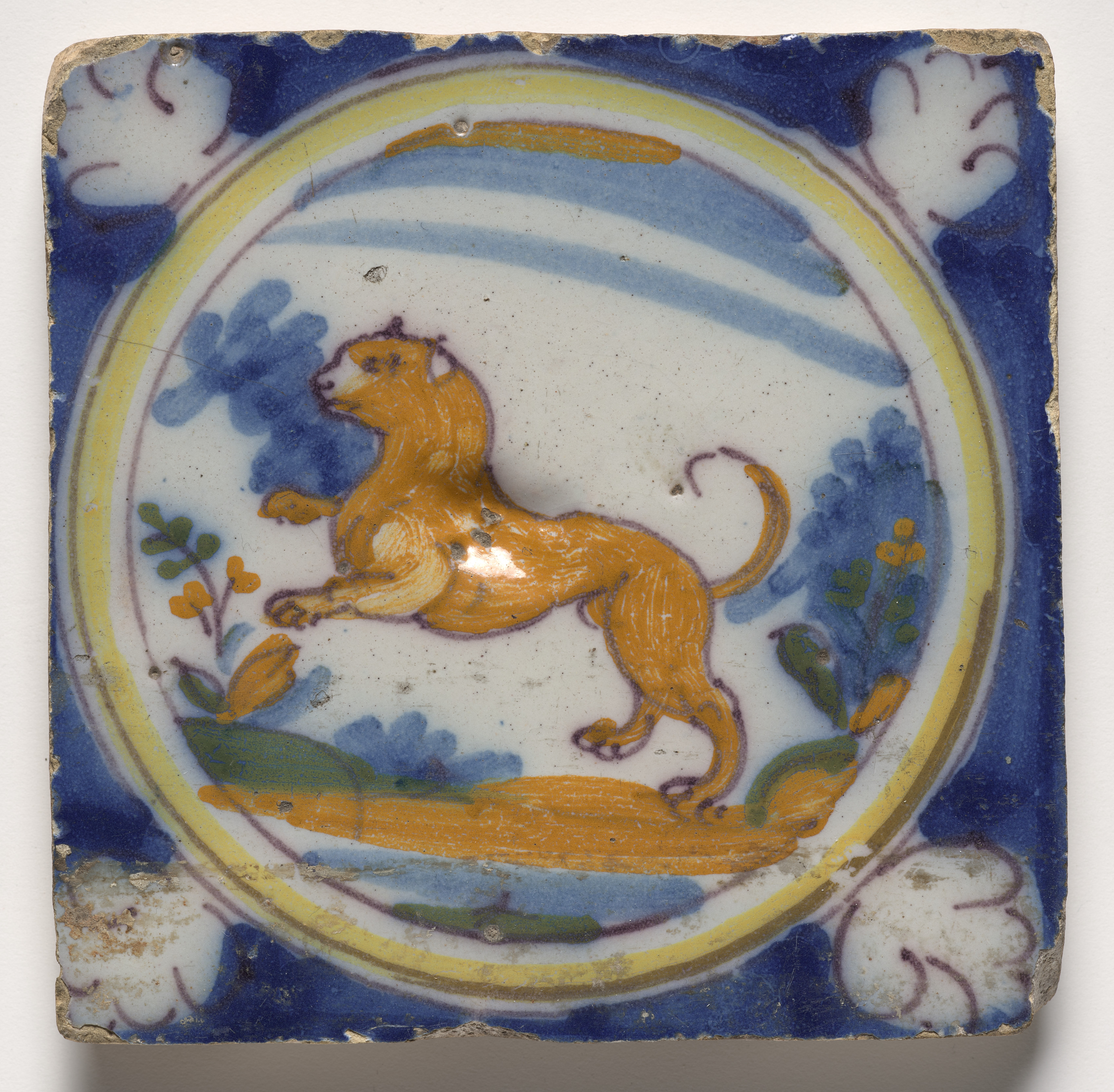 Square tile with rounded corners, featuring a lion in a circular design; lion is orange with a purple outline and is running left; background has blue wavy lines; surrounded by a yellow circle with a double purple border; blue background with white floral motifs; chipped edges showing grey underglaze. Wall Tile- Rampant Lion.