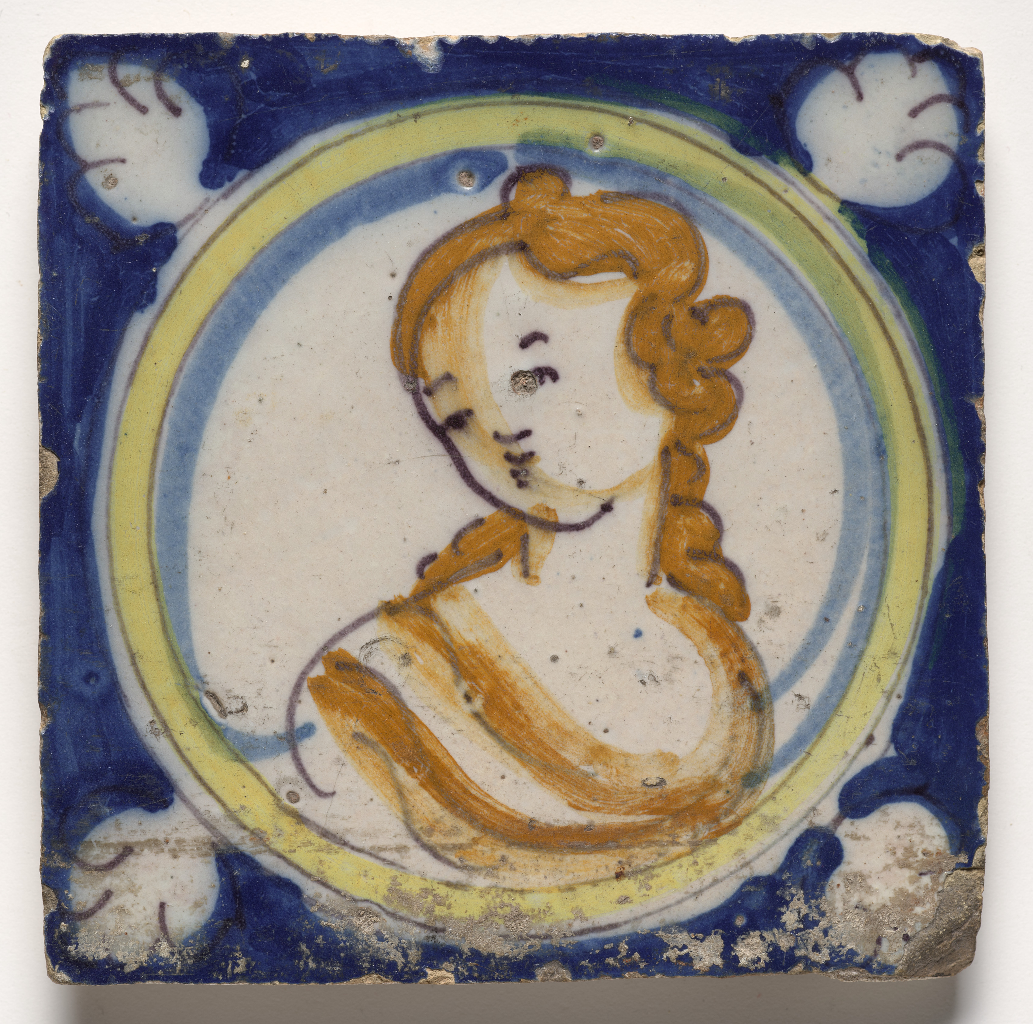 Square tile with rounded corners, featuring a female bust in a circular frame. The frame has a yellow outer ring, a blue middle ring, and a thin brown inner ring. The female bust has orange hair styled in a braid and wears an orange garment. The background of the tile is blue with four white floral motifs, one in each corner. The tile has a worn and chipped appearance.