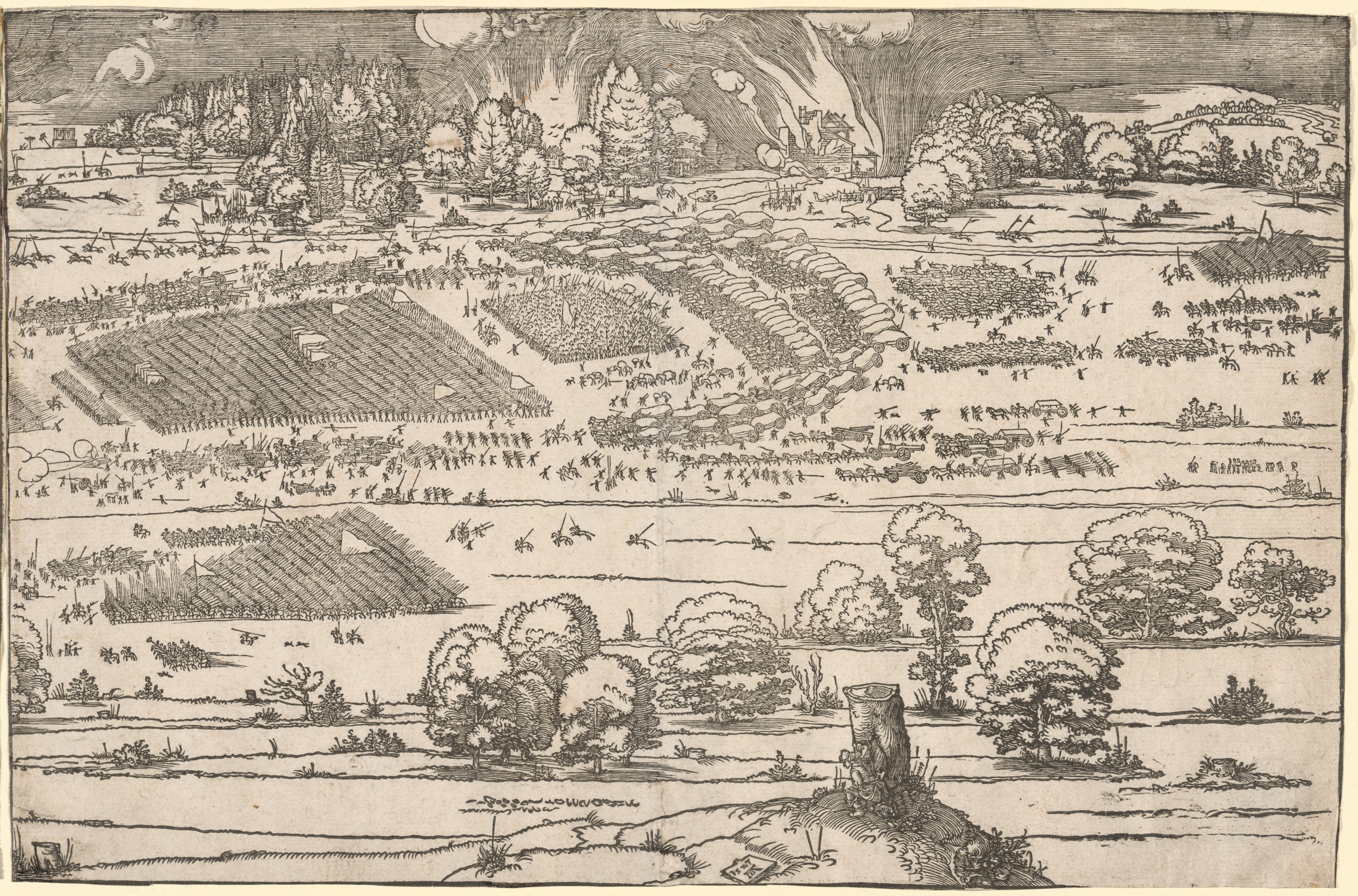 The image depicts a black and white drawing of a landscape with a large military encampment. The drawing is divided into sections by horizontal lines, with the top section showing a fortified area on the left and a town on the right, surrounded by trees and a cloudy sky. In the middle section, there are several groups of people, some in formation and others scattered around. A large rectangular formation of people is on the left, with several smaller groups to the right. The bottom section shows a more natural landscape with trees, bushes, and a stump in the foreground. The entire scene is drawn in a detailed and realistic style, with many lines and shading used to create depth and texture.
