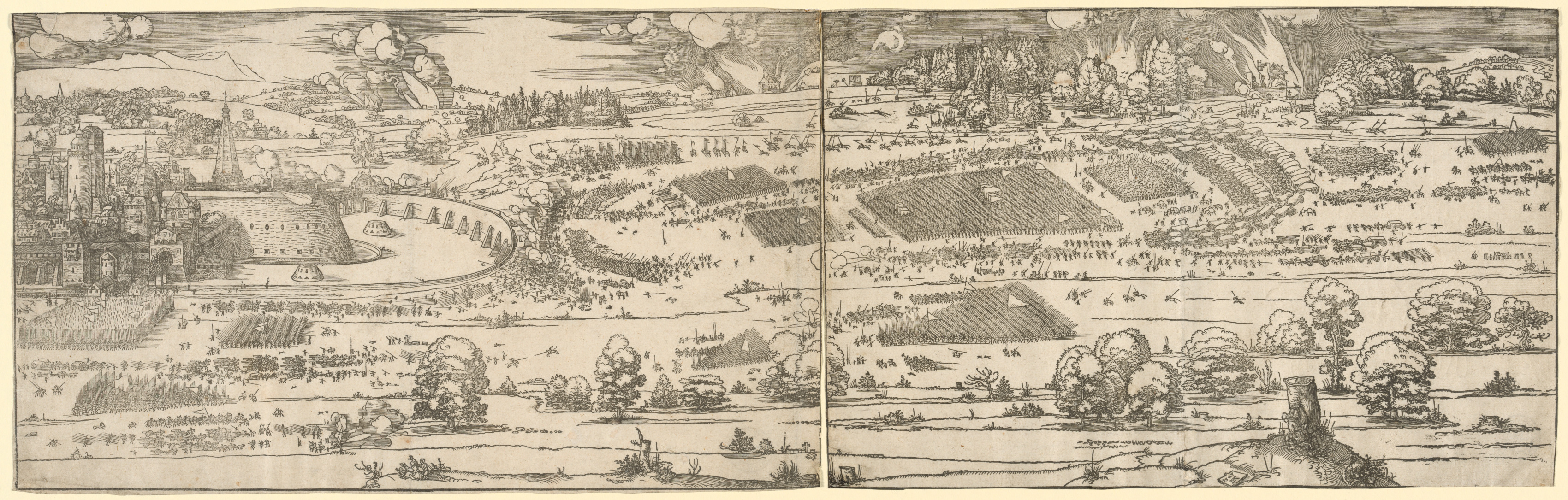 A black and white drawing of a landscape with a fortress under siege. The fortress is on the left side, surrounded by a high wall with a wide, rounded curtain wall and a tall, thin tower. A group of people are gathered outside the fortress, with some appearing to be soldiers. There are several groups of people in the surrounding landscape, some on horseback and some on foot. The landscape features trees, hills, and what appears to be a field or garden with rectangular plots. There are also several smoke clouds and explosions throughout the scene. The image spans two pages, with a vertical line down the middle. The style is detailed and realistic, with many lines and shading.