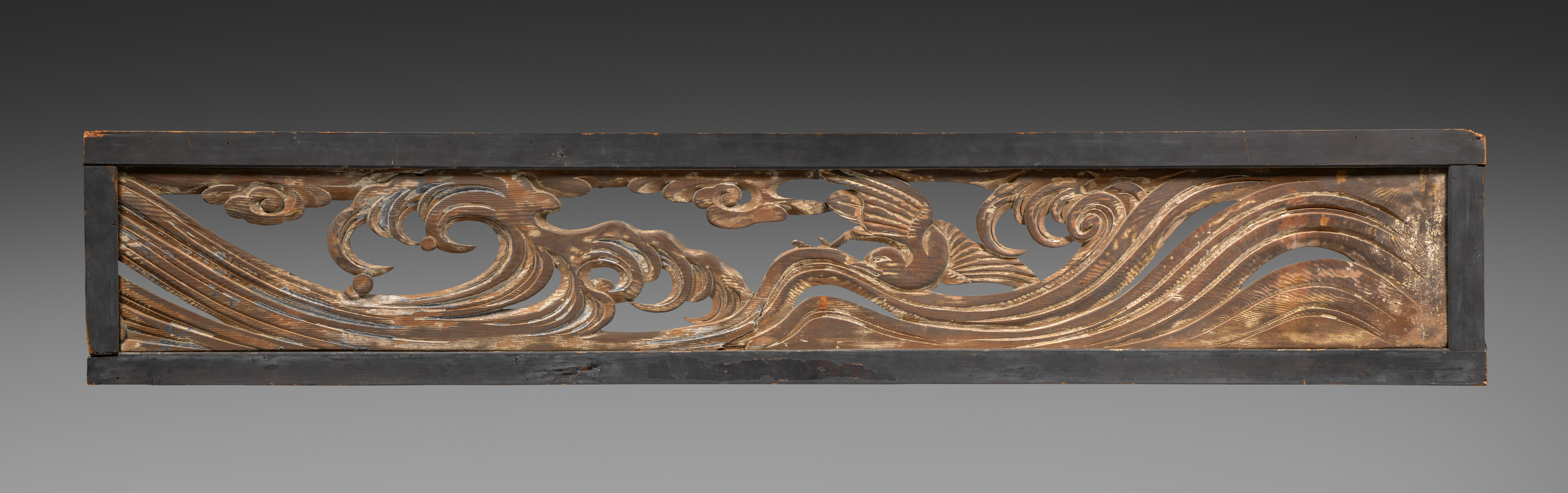 The image depicts a rectangular, bronze-colored artwork with a black frame, titled "Chidori and Waves (Ramma)" by an unknown artist. The frame is rectangular and black with a flat top and bottom. The artwork inside the frame features a bronze-colored design with wavy lines that resemble ocean waves. The wavy lines are curved and flowing, with some areas featuring more defined curves than others. The background of the image is a gradient that transitions from dark gray at the top to light gray at the bottom. The overall design appears to be carved or etched into a material, possibly metal. The artwork is centered within the frame, with no visible signs of additional details or patterns beyond the wavy lines. The bronze color of the artwork has a slightly weathered appearance, with some areas appearing lighter or darker than others. The frame has a slight lip around the edges, and there are small signs of wear and tear visible along the edges and surface.