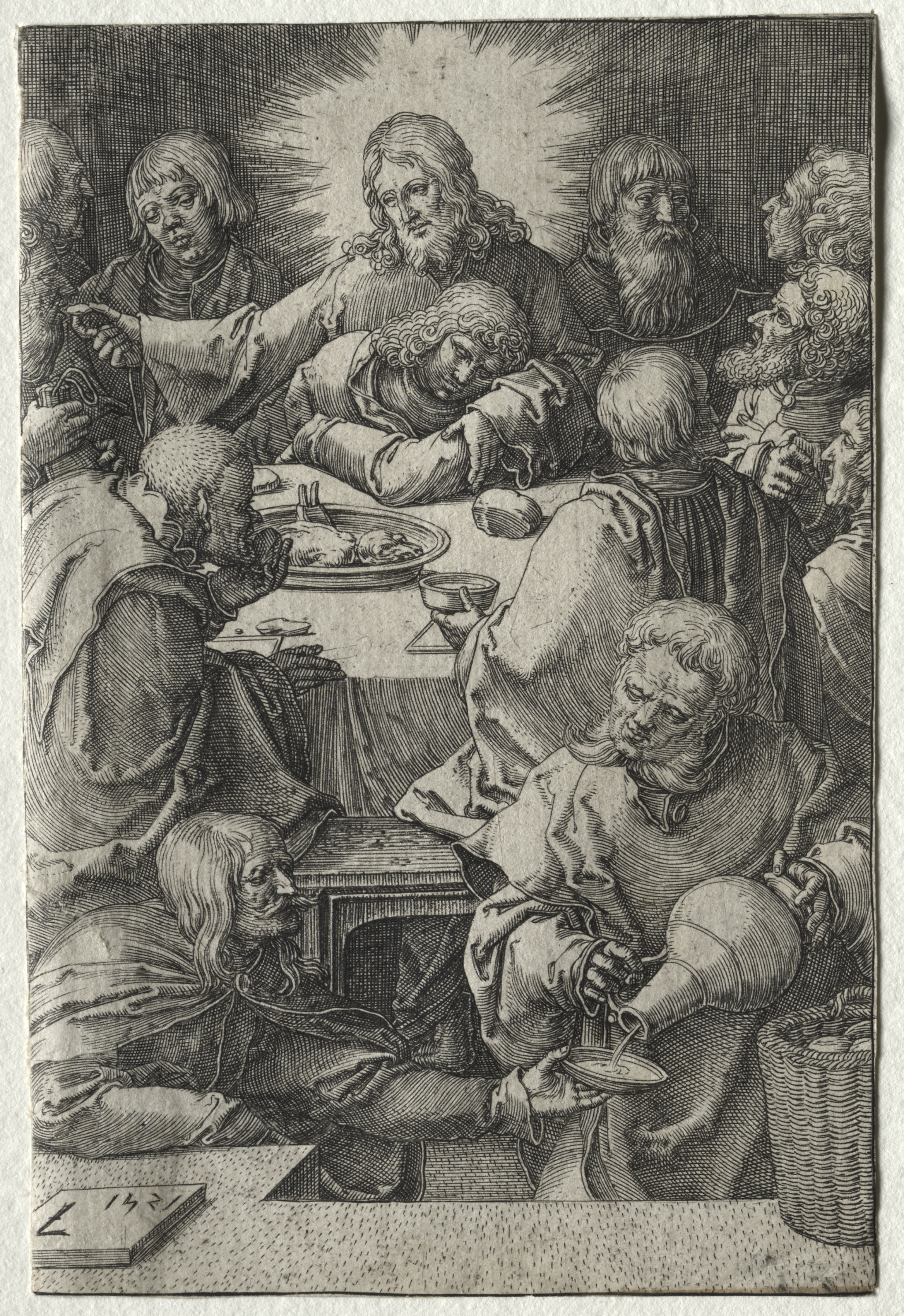 The Passion: The Last Supper by Lucas van Leyden depicts a black and white engraving of a scene with Jesus and 12 men. Jesus sits at the center top with long hair and a halo behind his head. He reaches across the table with his right arm towards a man on the left side who holds an object in his right hand. The table in front of Jesus holds plates and cups, with a large plate of food in the center. The men around the table have various expressions and hairstyles, with some wearing beards. The man to the right of Jesus has a large beard and bangs. The man on the lower right sits with his right leg crossed over his left and holds a plate. The background is shaded darker at the top and lighter towards the bottom. The men are dressed in robes and tunics. The table is rectangular with a tablecloth hanging down. The room has a dark tone. The composition shows the men in close proximity to one another.