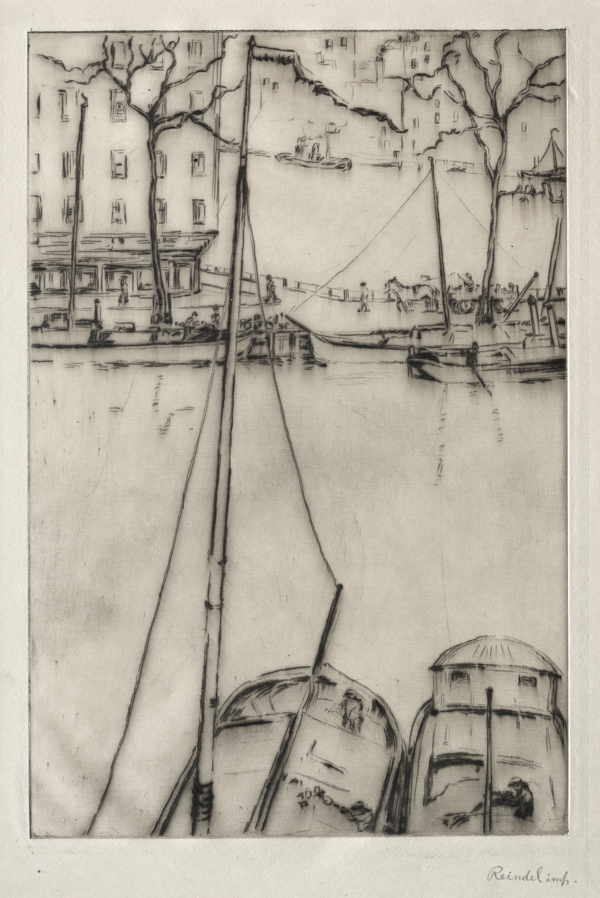 The image depicts a black and white etching of a canal scene. The scene features a body of water bordered by buildings on the left and right sides. There are trees along the water's edge on both sides. A boat is moored on the right side with a pole extending from it into the water. The boat on the left appears to have a pointed bow. The water reflects the surrounding buildings and trees. The buildings on both sides appear to be multi-story structures with windows. The scene is framed by a white border. The artist's signature is located in the bottom-right corner.