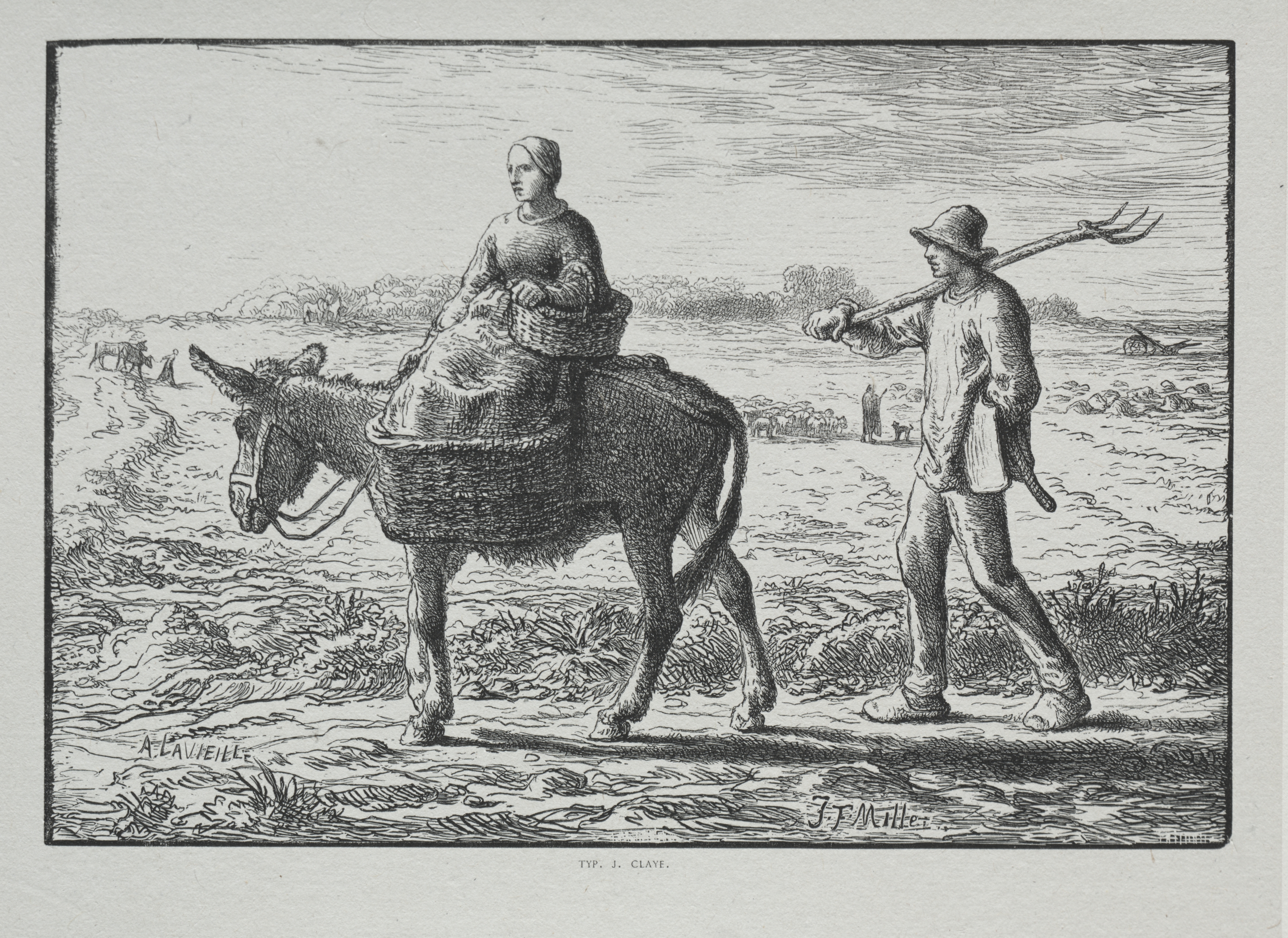 The image depicts a black and white drawing of a woman on a donkey with baskets on its back and a man walking beside it. The woman wears a long-sleeved dress and a head covering, sitting on a donkey with two large baskets on either side. The man walks to the right of the donkey, wearing a hat, a long-sleeved shirt, and pants. He carries a tool over his shoulder. The background shows a field with trees and other people in the distance. The sky is cloudy. The title of the image is "Four Hours of the Day: Morning" by Adrien Lavieille.