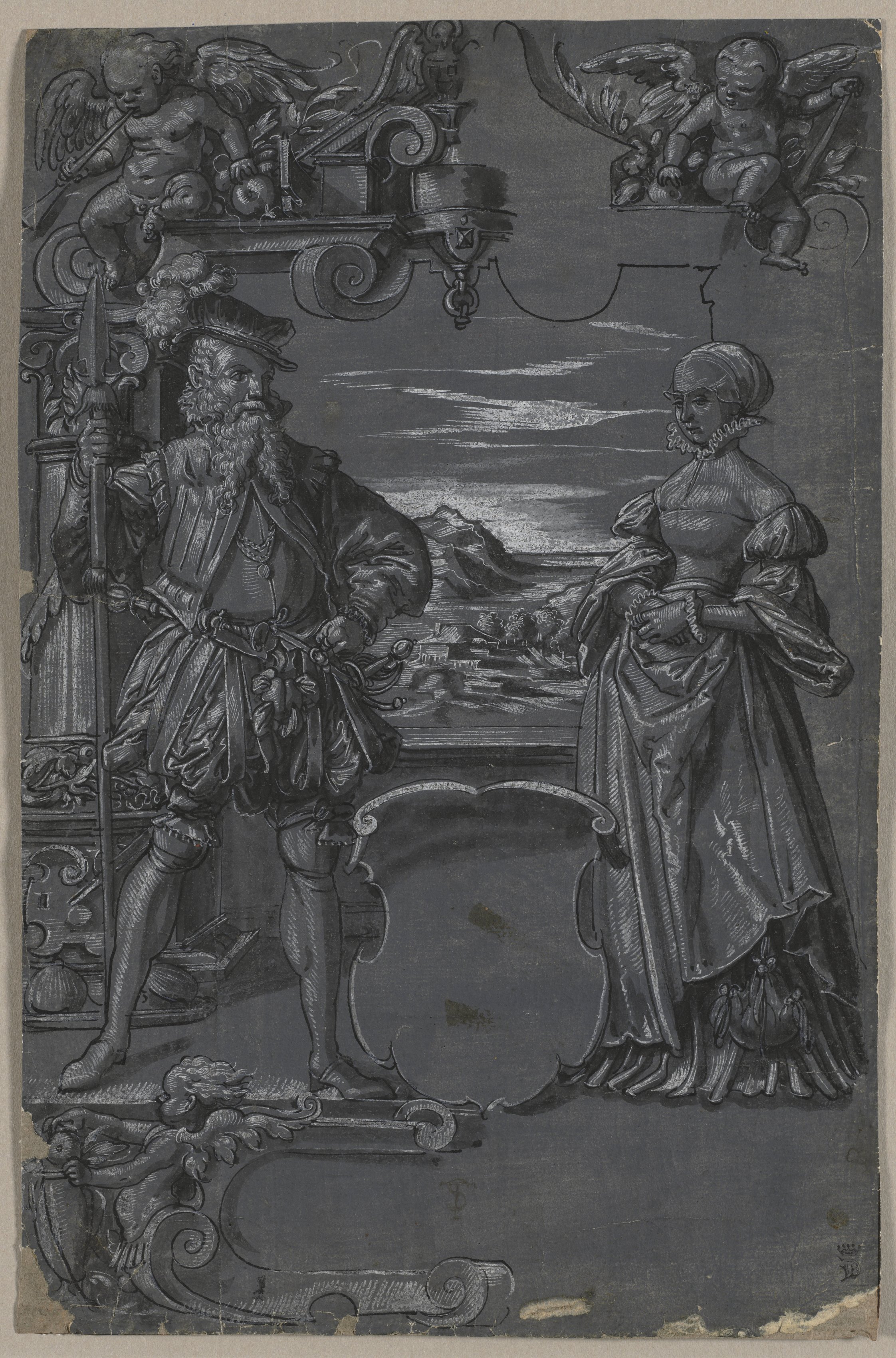 Black and white drawing of a man and woman in an architectural setting. The man is on the left, wearing a hat, a puffy-sleeved shirt, a belted waist, puffy shorts, and knee-high socks. He holds a long spear in one hand. The woman is on the right, wearing a puffy-sleeved dress and a head covering. The pair stand on a pedestal. The background shows a body of water with land on the horizon and a cloudy sky. Two cherubs are at the top, one on each side. The image is framed by ornate curlicue designs. The drawing style is detailed and ornate, with shading and texture. The overall mood is formal and elegant.