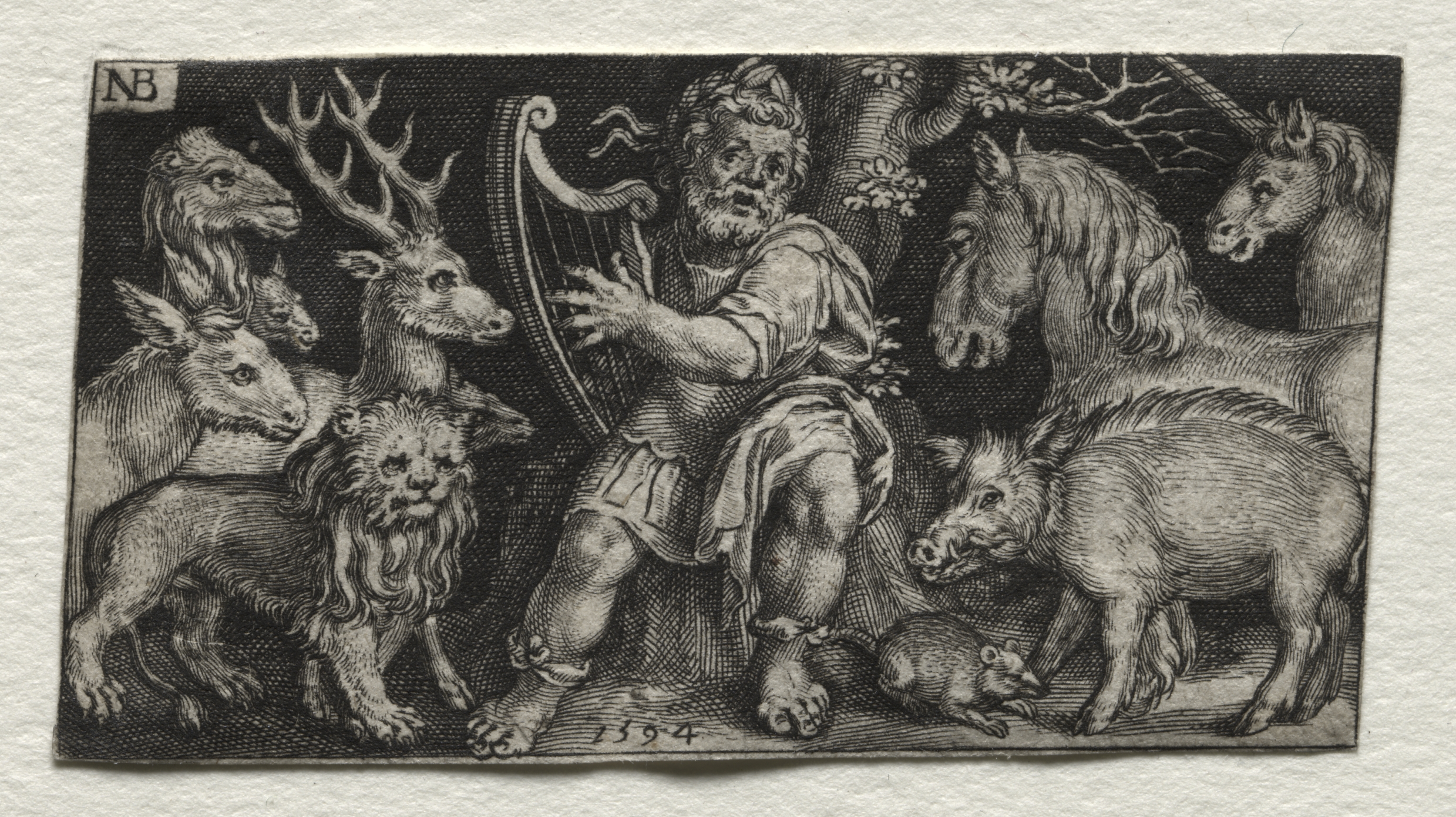 Black and white image of Orpheus playing a harp, surrounded by various animals. The man has curly hair and a beard, and is barefoot, wearing a short tunic. He sits on one knee, left hand on the neck of the harp and right hand on the strings. Animals to his left include a deer with antlers, a goat-like creature, a lion. Animals to his right include a boar, a small rodent-like creature, a horse, and a unicorn. The man and animals are in front of a tree with foliage and bare branches. The background is dark. The image is on a textured white background. The image is by Nicolaes de Bruyn. The image depicts 'Orpheus Charming the Animals'.