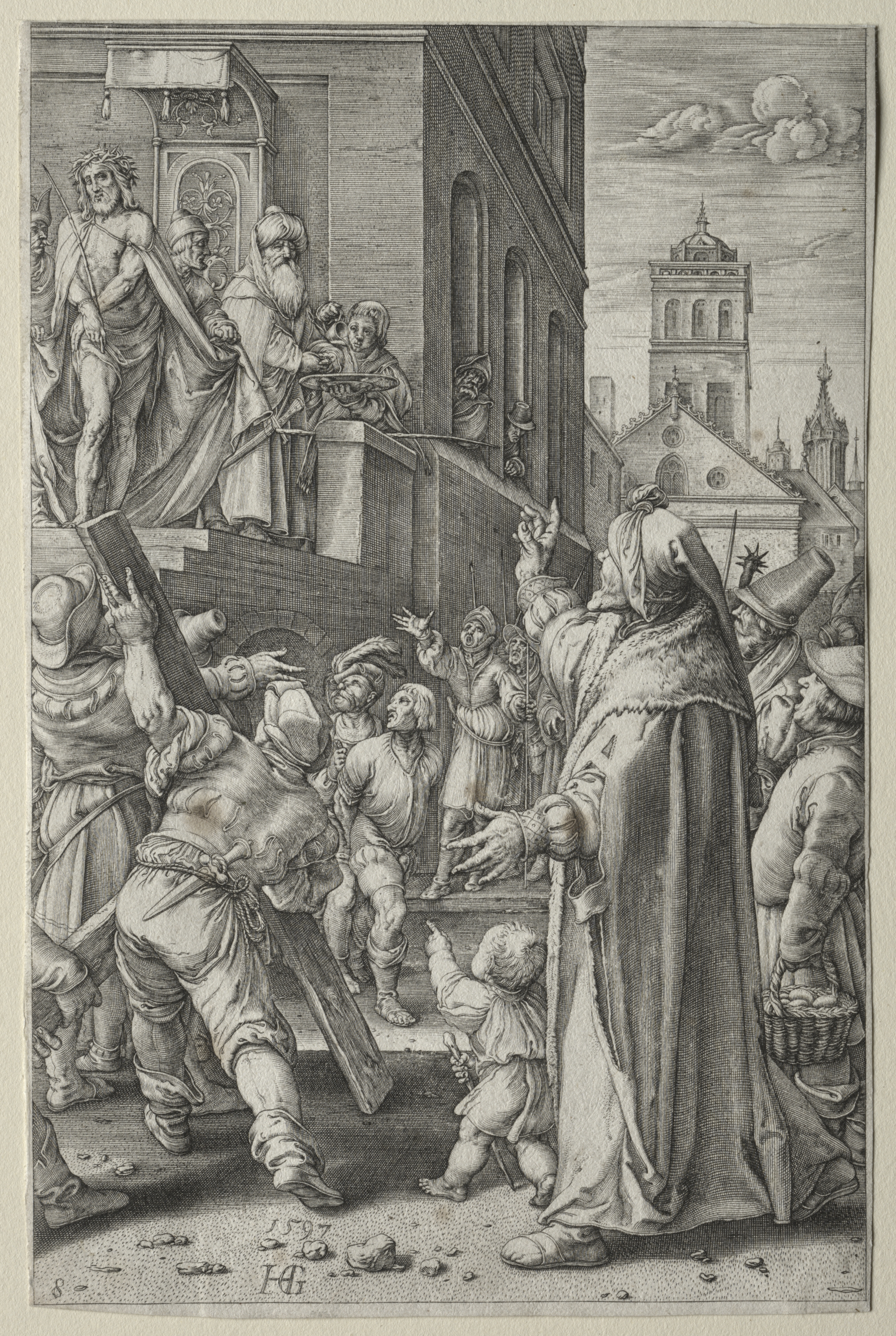 Black and white image. Christ stands on steps. Christ wears a crown of thorns; is bare-chested; and wears a cloth wrapped around lower body. Christ's right arm held behind him; left arm by side. People on steps look on. People in foreground jeer. One man holds up wood. One man holds a child. Large crowd; some men wear hats. Man in robe gestures to Christ. City buildings and church steeple in background. Sky with clouds. Signed "HG" and dated "1597".