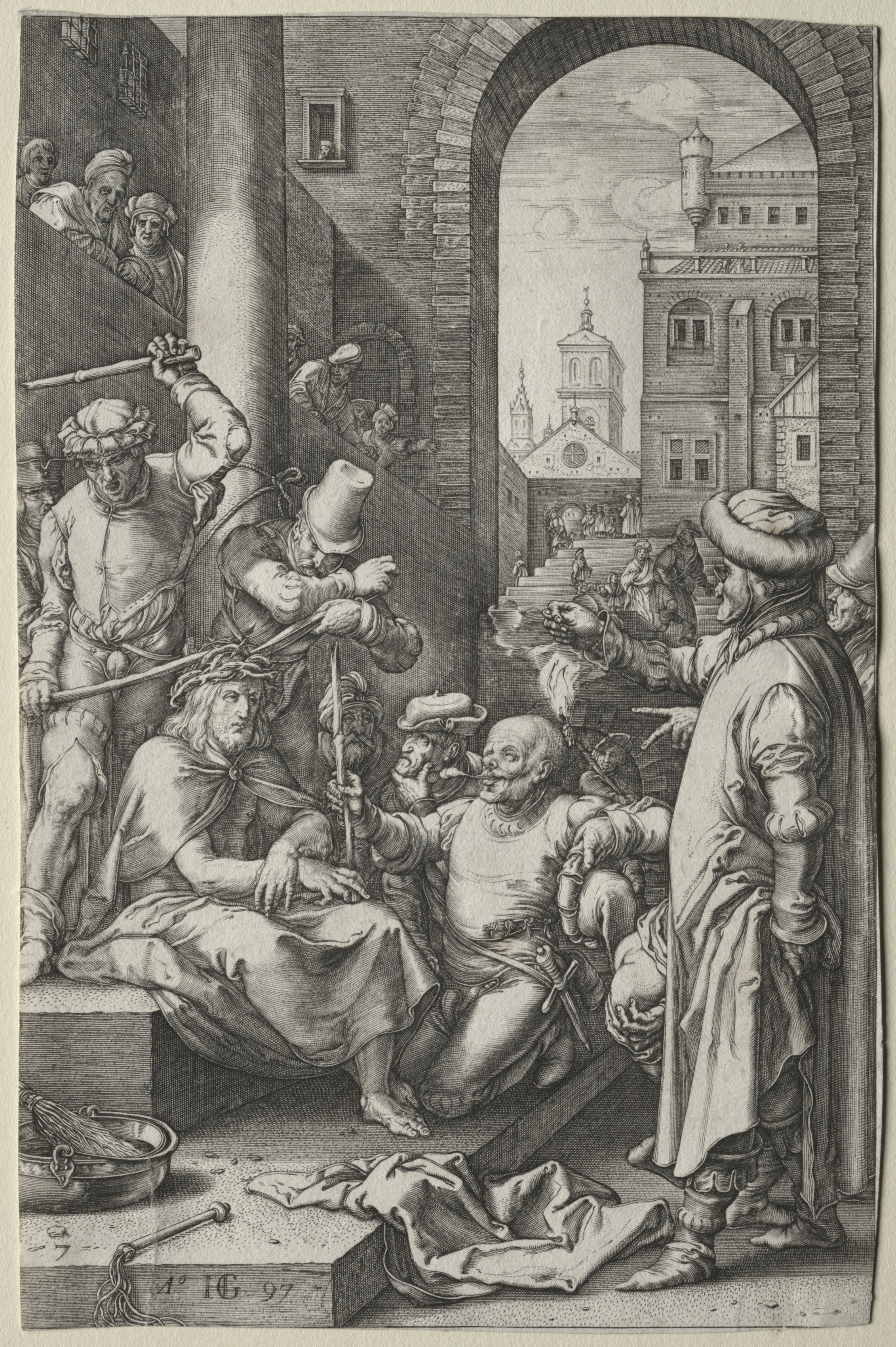 Black and white image of a man sitting on a platform being hit on the head with a stick by a man in armor. The man sitting has long hair and a crown of thorns. Others are nearby watching and one is standing on the right. There is a large archway behind them leading to a city with buildings. A man on the left holds a sword. A bowl and other objects are on the ground.