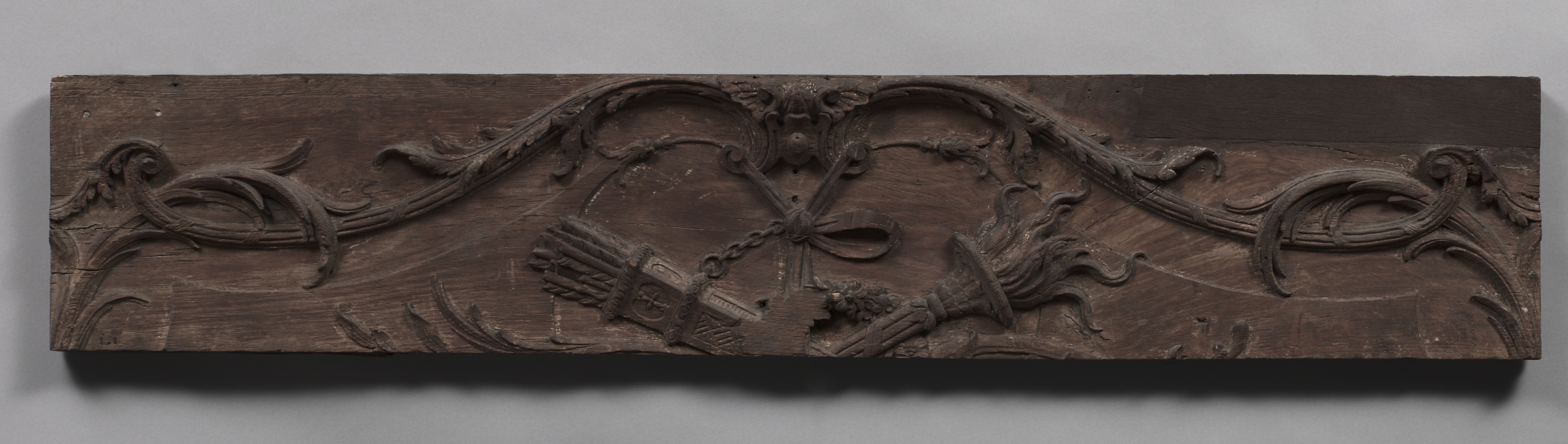 Dark brown wooden panel with carved design. The panel is rectangular with a flat top and bottom. Carved design on the panel includes two hands, one on the left and one on the right, with the left hand holding a cylindrical object and the right hand holding a chain. The hands are positioned at the bottom center of the panel. Above the hands is a ring on the chain. The panel has curved, vine-like carvings on either side of the hands and ring, extending to the edges. The background of the image is light gray. The panel casts a shadow on the background. The panel is titled "Panel" and is by an unknown artist.