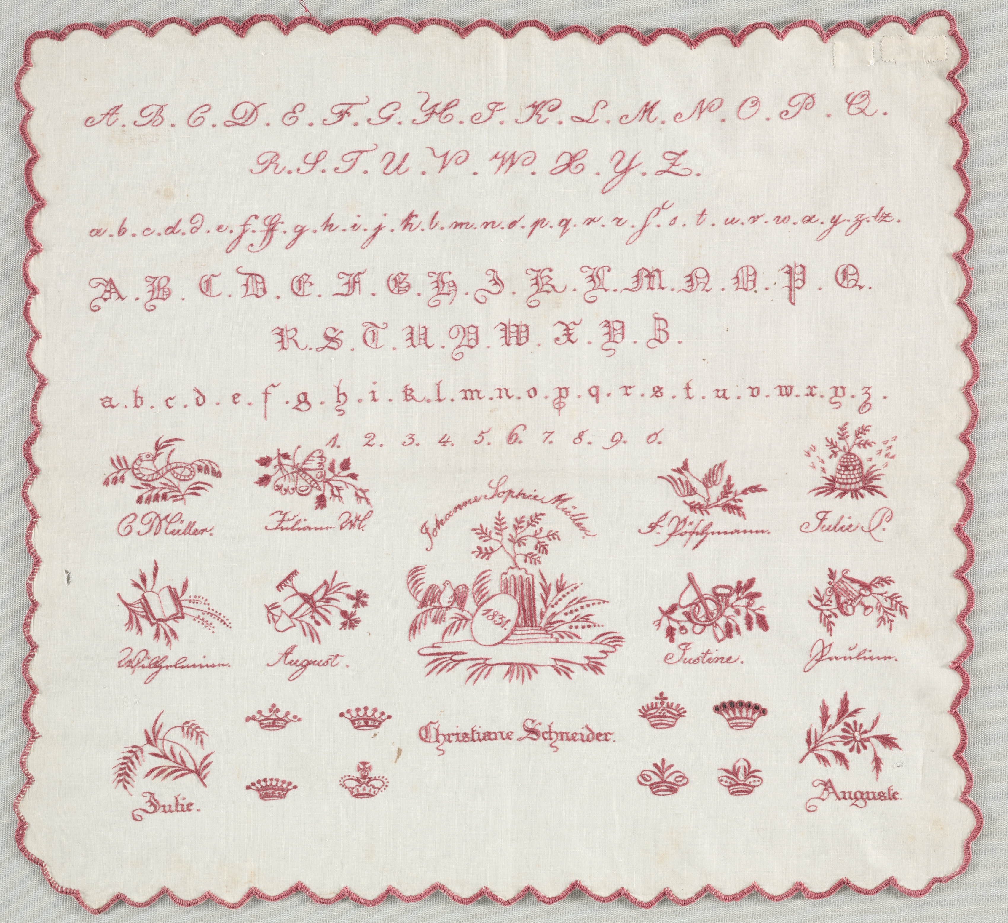White fabric with scalloped edges and red embroidery. The top section features four rows of alphabet letters in various cursive and serif fonts. The alphabet includes capital and lowercase letters. The bottom section contains several illustrations and names, arranged in three rows. The illustrations include a bird, flowers, crowns and foliage. The names are written in cursive script next to or under the illustrations. The names include G. Walker, Christine Schneider, and Julie. The fabric has a light gray background visible around the edges. The title "Sampler" and the artist's name are associated with this image.