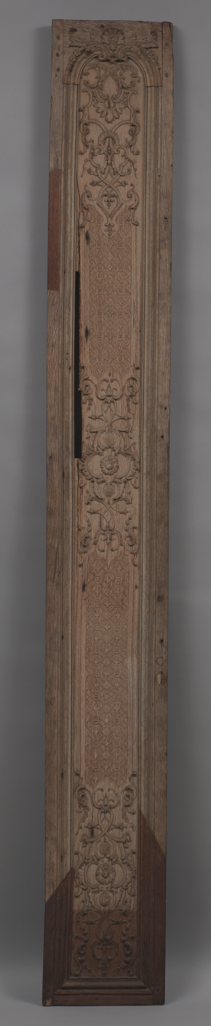 The image shows a tall, narrow wooden panel with intricate carvings. The panel is rectangular and oriented vertically. It has a light-colored wood tone with darker areas, possibly from aging or staining. The panel features a central section with a raised border and three distinct sections of ornate carvings. The top and bottom sections have similar carvings, while the middle section appears to have a different pattern. A long, thin recessed area is on the left side. The background of the image is a plain gray color, which helps to highlight the details of the panel. The panel appears to be by artist "Panel".