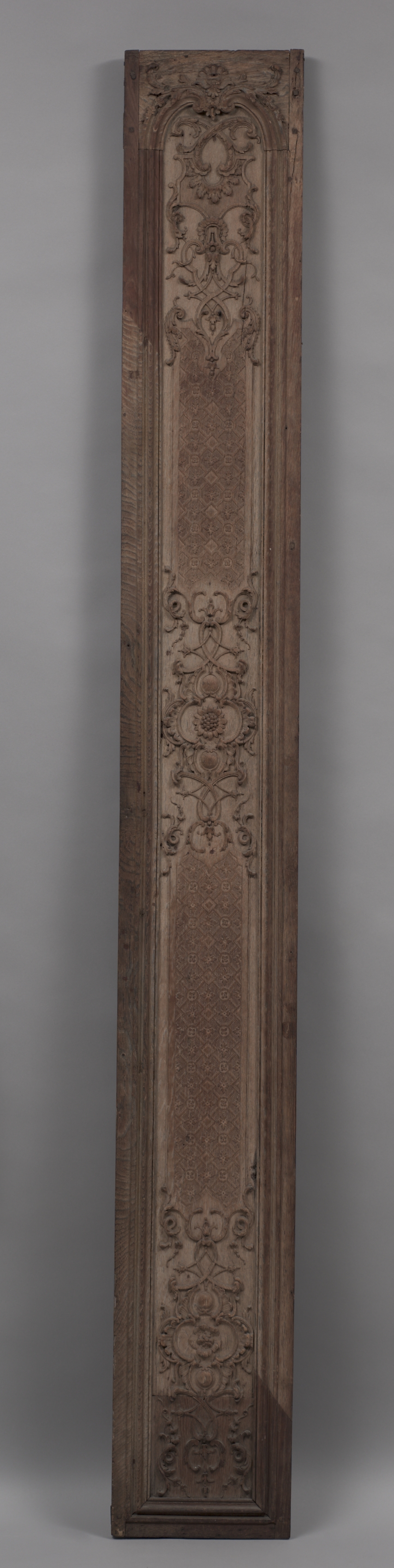 Tall, narrow, rectangular wooden panel with a raised border. The panel has a light brown color with darker brown accents. The top and bottom feature symmetrical carved floral designs. The center has two long, thin, rectangular sections with intricate patterns. The background is gray with a shadow cast by the panel. The panel appears to be a piece of art by an unknown artist, titled "Panel".