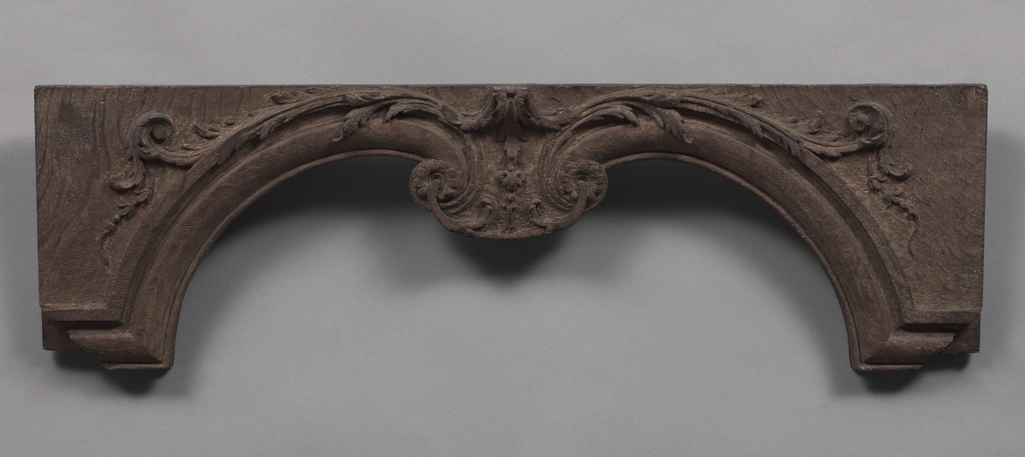 Wooden panel with carved arch. The panel has a rectangular shape with a semicircular carved arch in the middle. The arch has a flat top and both ends connect to the rectangular frame. The arch is adorned with ornate carvings of leaves and flowers. The carvings are symmetrical on both sides of the arch. The panel appears to be made of dark brown wood. The background of the image is a plain gray color. The panel casts a shadow on the background. The title of the panel is "Panel". The artist of the panel is unknown.