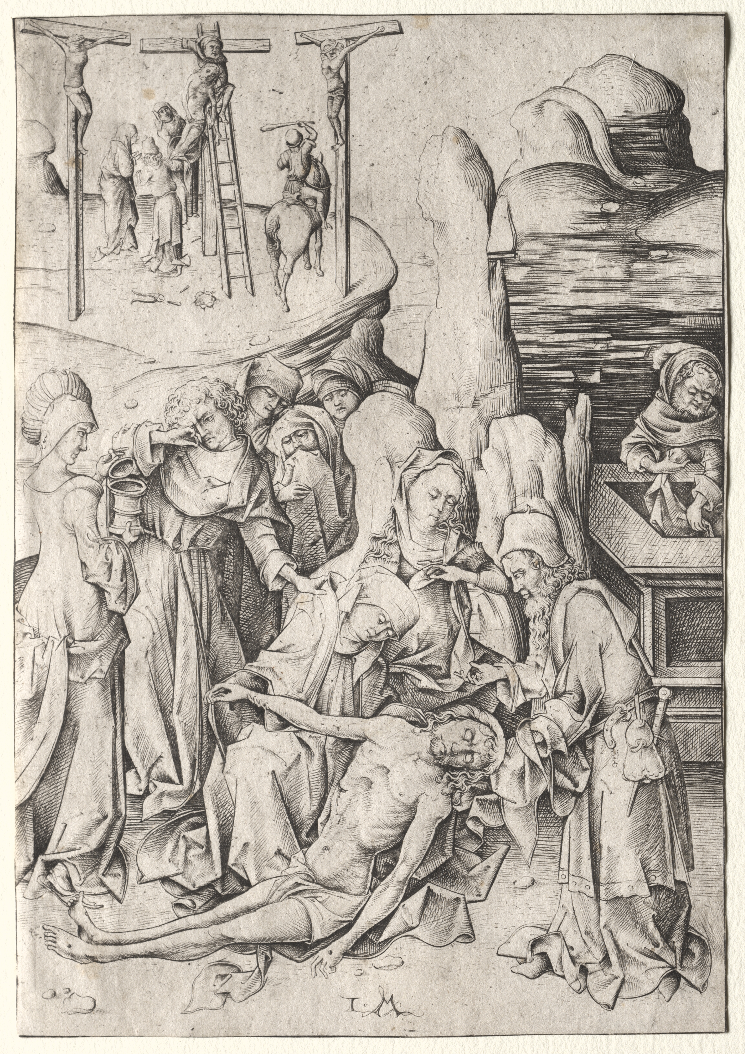 Black and white drawing of a group of people gathered around a body on the ground. The body on the ground is naked from the waist up and has a cloth wrapped around the lower body. The body lies on the ground with one leg straight and the other bent. The head of the body is to the right and tilted down. The people around the body wear robes and head coverings. Some of the people are touching the body. In the background, to the left, there is a scene with three crucifixes and people around them. To the right of the main scene, there are stacked, uneven, rocky formations. A figure sits on a ledge amidst the rocky formations. The drawing is bordered by a thin white frame. The style is detailed and appears to be from the Northern Renaissance period.