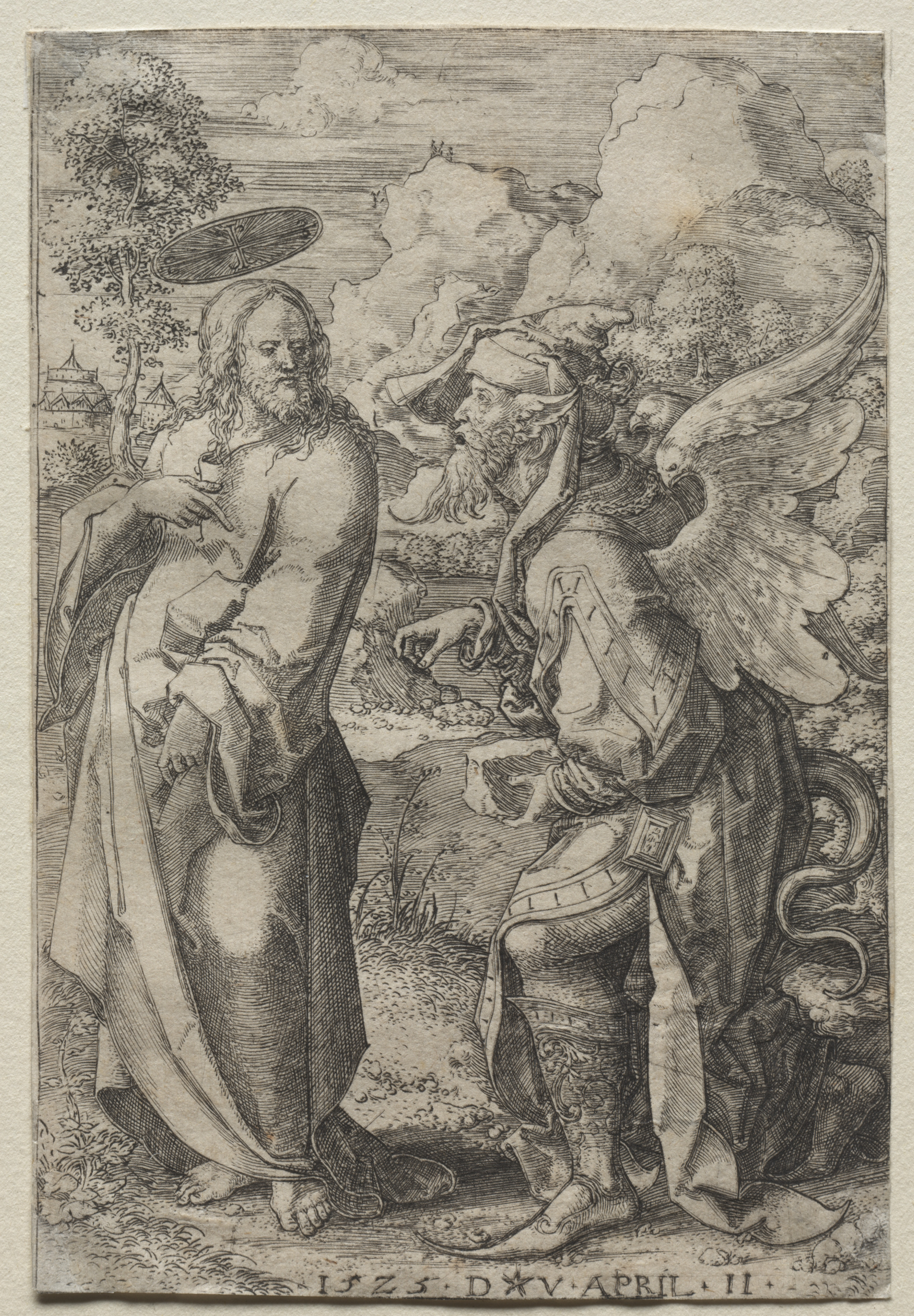 The image depicts a black and white engraving of a scene with two figures. The figure on the left is a man with long hair and a beard, wearing a robe and no shoes, holding an object. He has a halo above his head. The figure on the right is a winged man with a beard, wearing armor and a hat, holding out his hand. The background includes a tree, a cloudy sky, and a landscape with buildings in the distance. The engraving is signed with the date "1525" and "V APRIL II" at the bottom. The style of the engraving suggests it may be a religious scene. The figures are positioned in a confrontational manner. The overall mood of the scene appears to be one of tension or temptation. Dirk Vellert's Temptation of Christ.