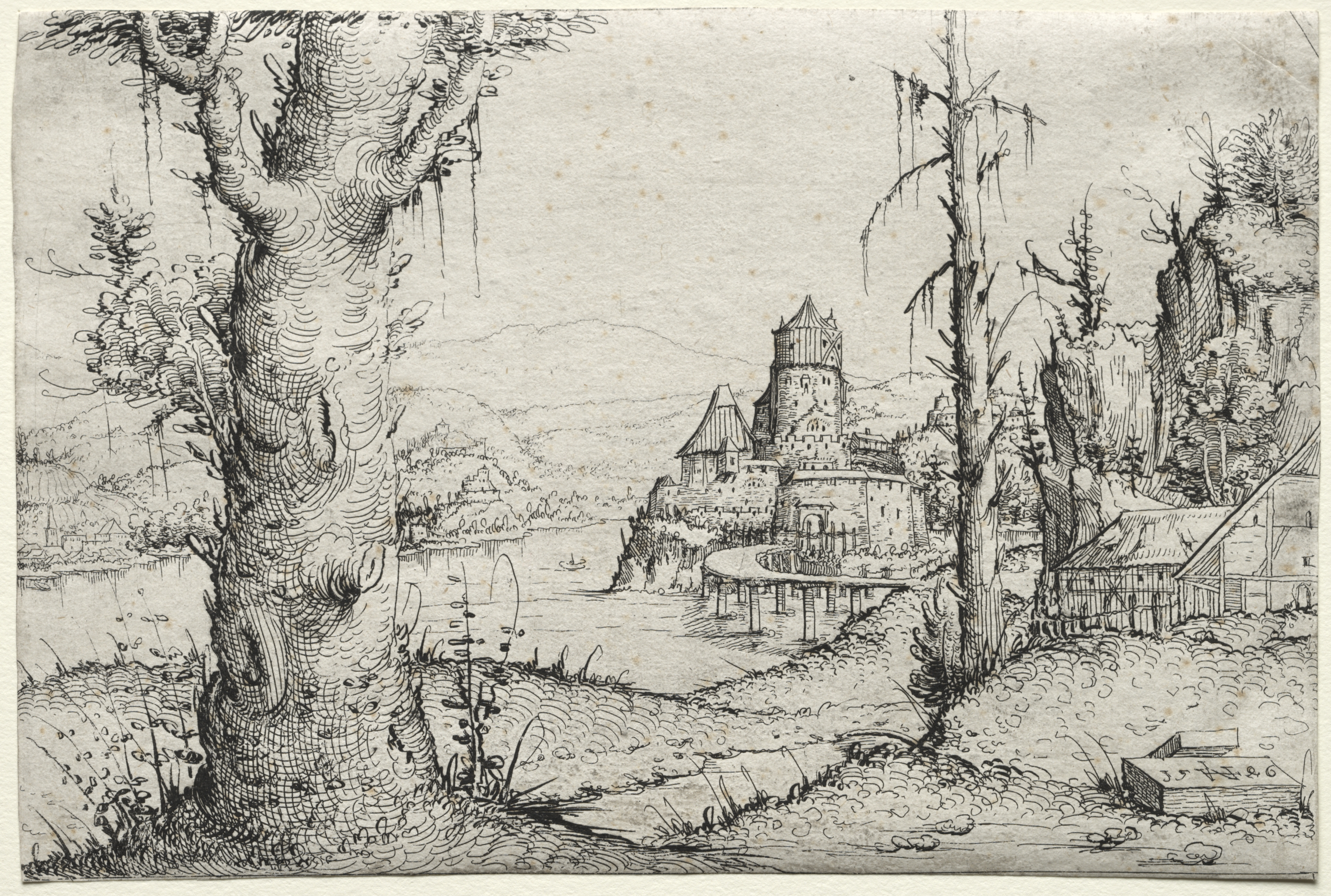 Black and white landscape drawing of a river with a rounded bridge leading to a fortified town with a tall tower. A large tree trunk with gnarled branches is on the left side, and a smaller bare tree trunk is on the right. A small wooden bridge is in the foreground on the right. The town has several buildings with steeply pitched roofs and a stone wall. Mountains are in the background under a hazy sky. The drawing is done in a detailed, realistic style with many lines and shading. The paper is off-white with darker spots.