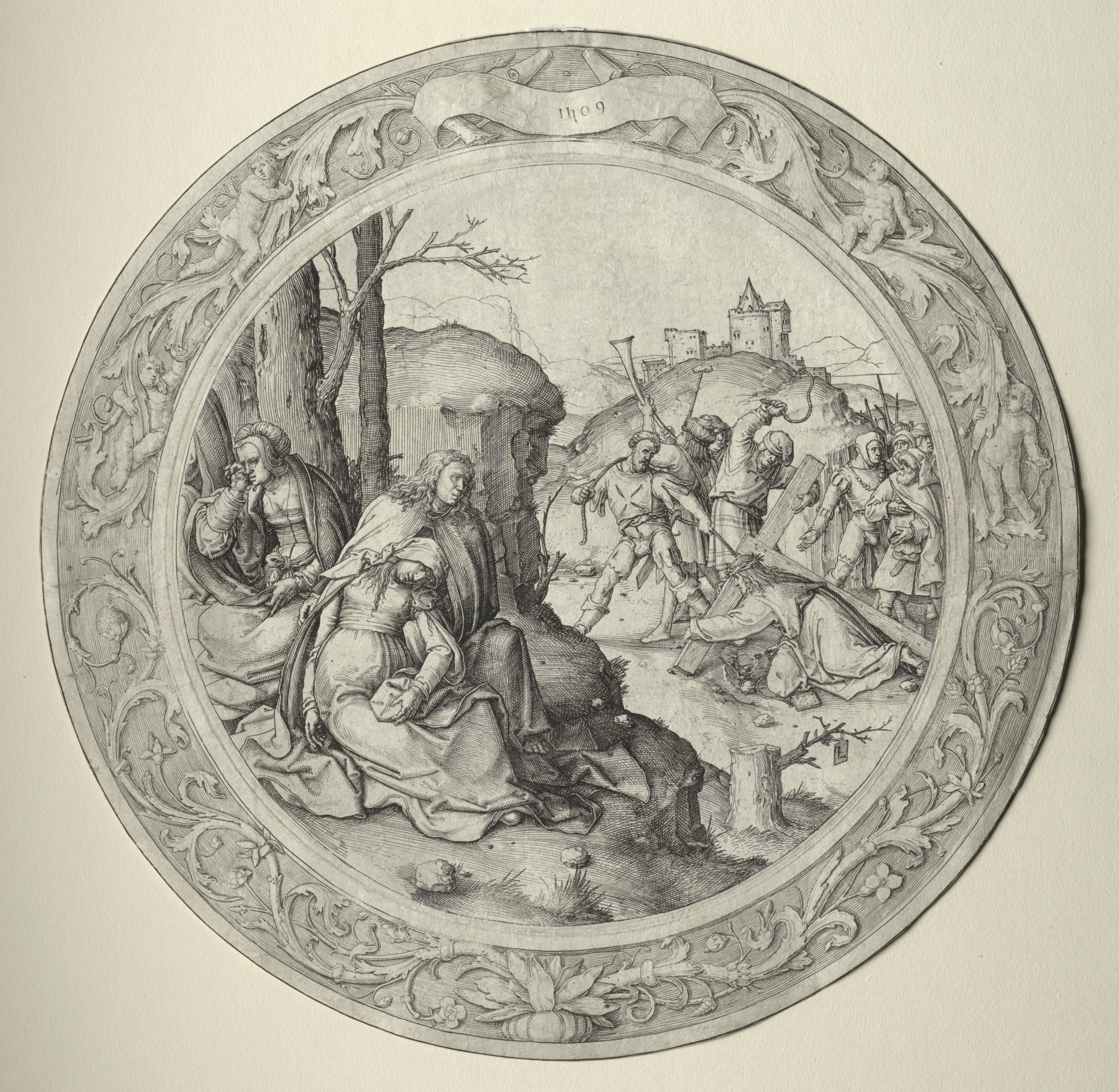 A black and white drawing of a circular scene. The circular scene is surrounded by an ornate border with foliage and human figures. Inside the circle, a man carries a large cross while walking to the right. He is surrounded by a group of people. On the left, two women kneel beside a tree. In the background, a hill with a castle and a bare tree. The sky is clear. The image depicts Christ carrying the cross.