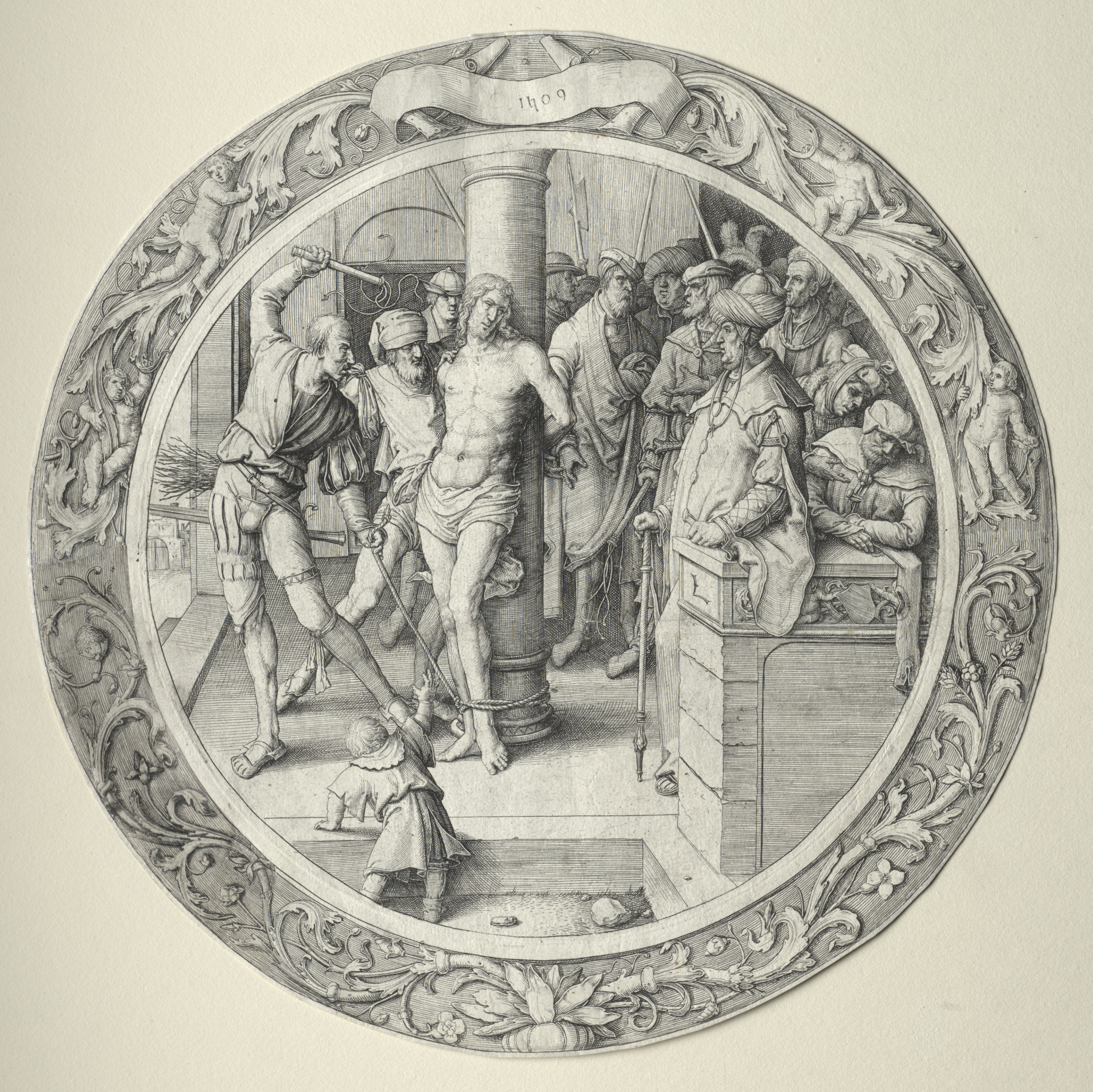 The image depicts a circular scene with a border of decorative foliage and cherubs. The scene shows a man with long hair and a cloth wrapped around his waist, barefoot and with his hands bound behind his back to a column. He is surrounded by about 10 men, some wearing turbans and some with swords. One man on the left is holding a bundle of sticks and appears to be about to hit the central figure. A man on the right sits on a raised platform. The year "1509" appears on a banner above the scene. The entire scene is framed by an ornate border featuring leaves, flowers, and cherubs. The image is in shades of gray on a beige background. The style is detailed and realistic. The image is titled "The Round Passion: The Flagellation" by Lucas van Leyden.