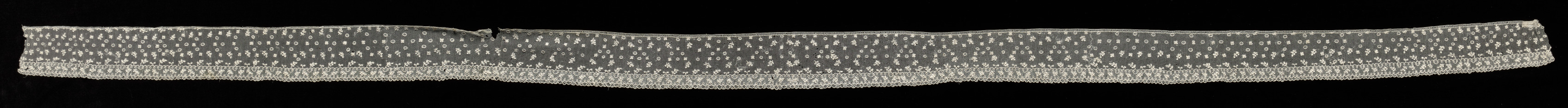 The image depicts a long, thin, curved strip of white lace on a black background. The lace is made up of numerous small holes arranged in a repeating pattern. The lace has a wavy shape, with a slightly raised edge along its length. It appears to be made of a delicate, intricate material. The lace fills the top portion of the image, with solid black above and below.