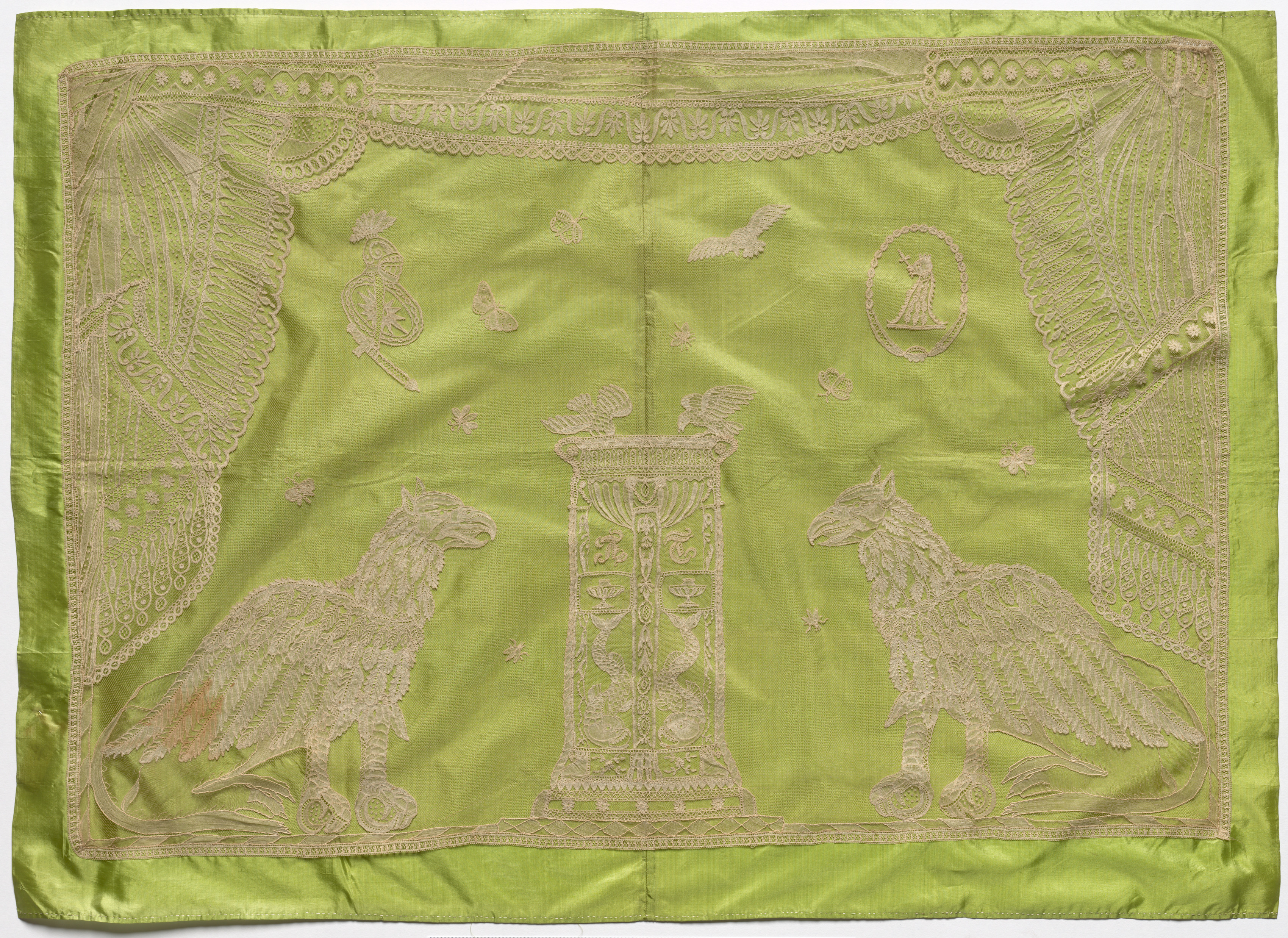 The image is of a light green silk panel with intricate embroidery. The panel is rectangular and features a thin border around the edges. The embroidery on the panel includes two large birds on either side of a pedestal. The birds are facing each other and have their wings spread out. The pedestal is tall and ornate, with carvings on it. There are also several other designs embroidered on the panel, including a circular frame with a figure inside. The panel titled "Lace Panel" is by the artist untitled.