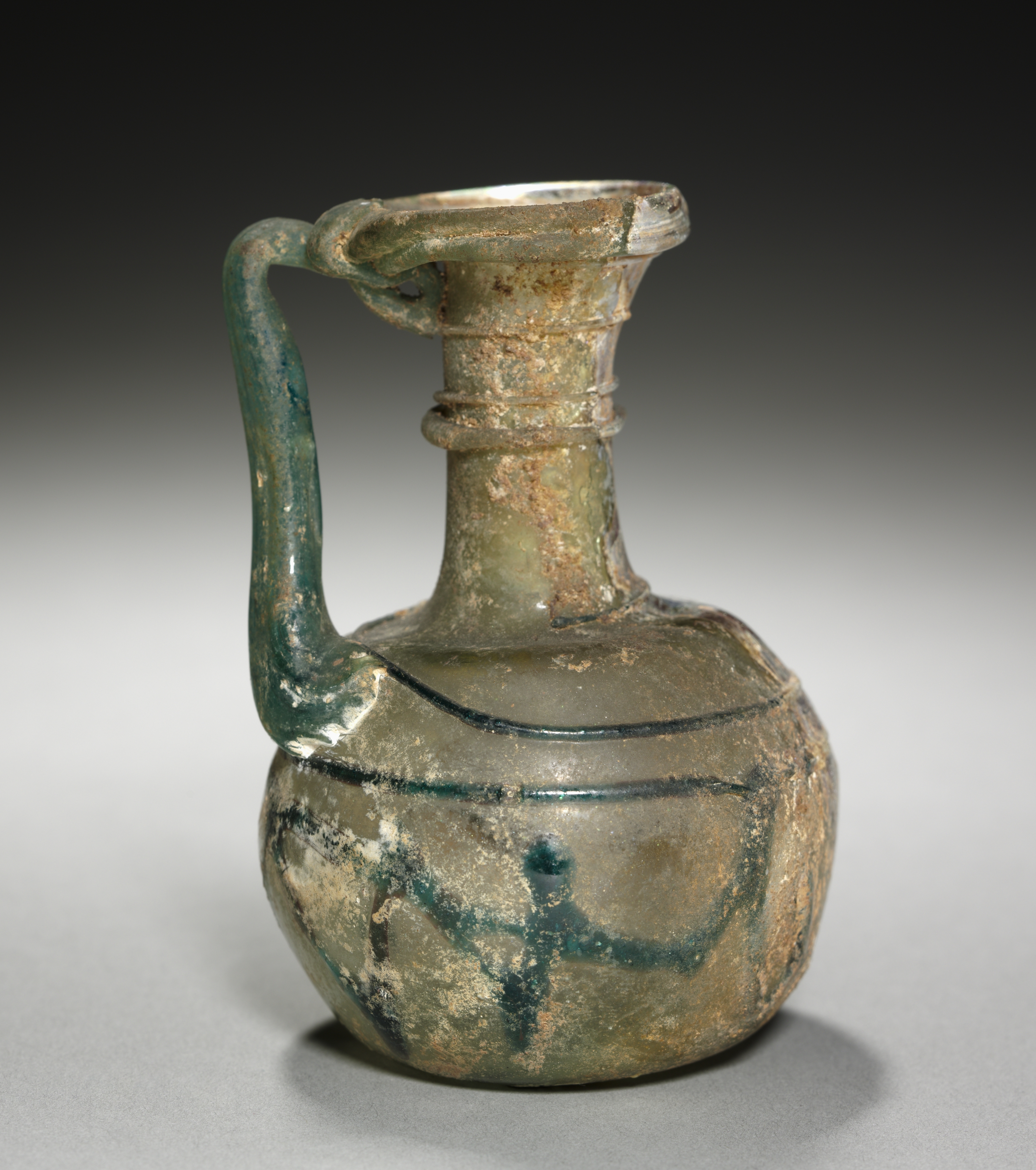 The image shows a weathered jug with a handle on the left side. The jug is primarily greenish-gray with spots of brown. A dark green handle extends from the body of the jug, curving upward then back down to attach to the rim. The body of the jug is rounded and bulbous. A dark green line wraps around the body in a squiggly line. The top portion of the jug narrows then flares out slightly at the rim. The jug, titled Squat Juglet, is by an unknown artist.