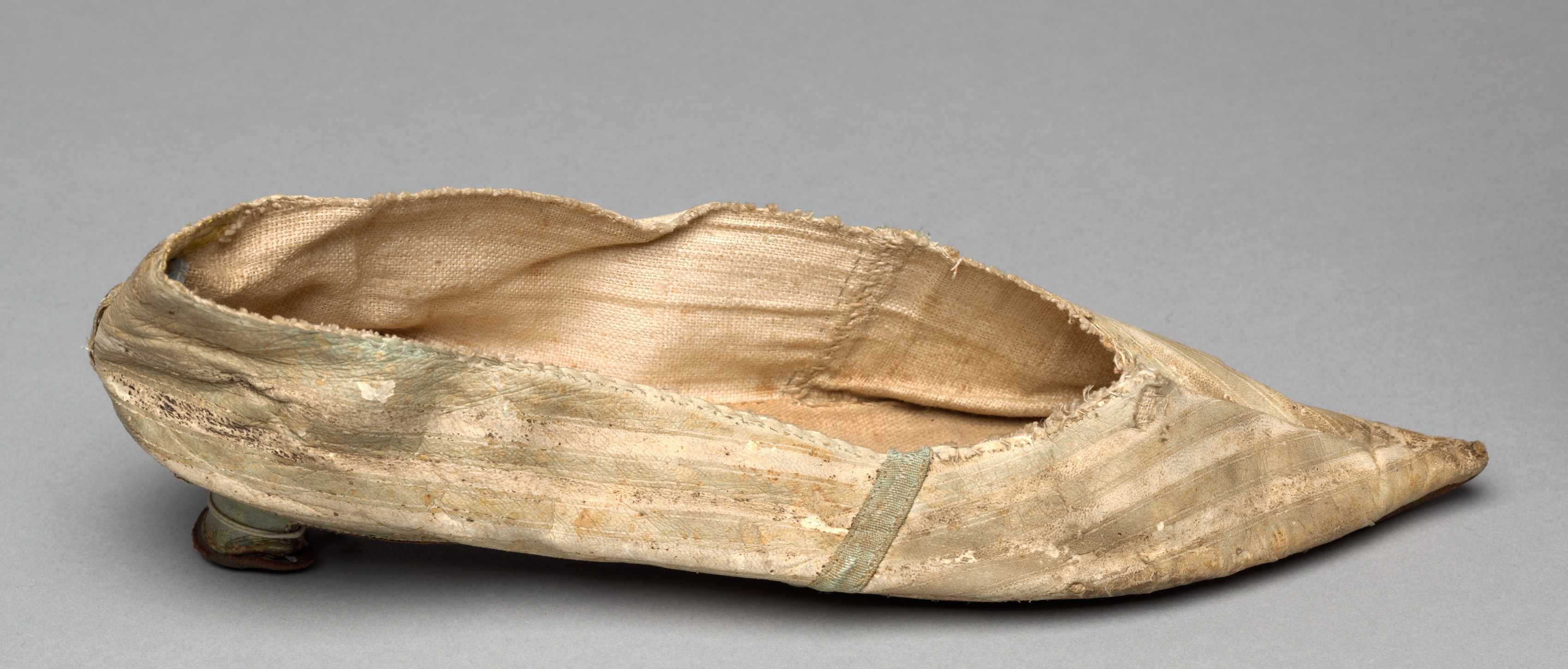 A vintage women's slipper with a light-colored exterior, possibly made of silk or satin, featuring a low heel and a pointed toe. The shoe appears to be old and worn, with a frayed edge around the opening and a visible seam on the side. The interior of the shoe is a lighter shade of tan, with a smooth fabric lining. A thin strap or strip of material runs along the side of the shoe, and the heel is small and rounded. The background of the image is a plain gray color. Title: Slipper.